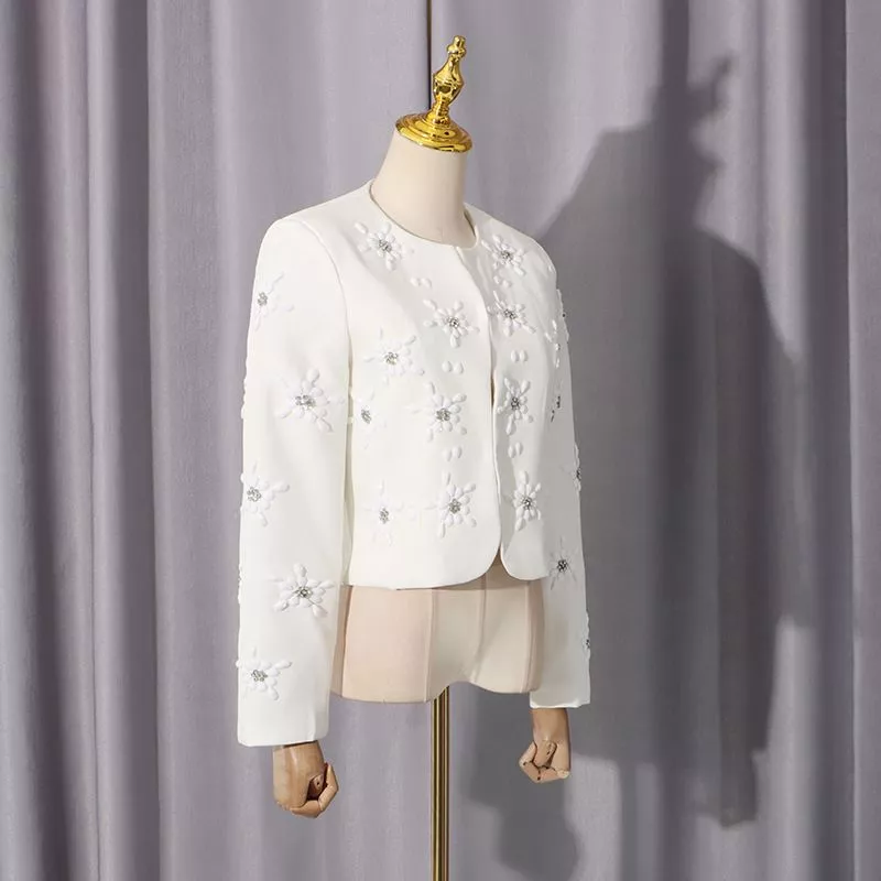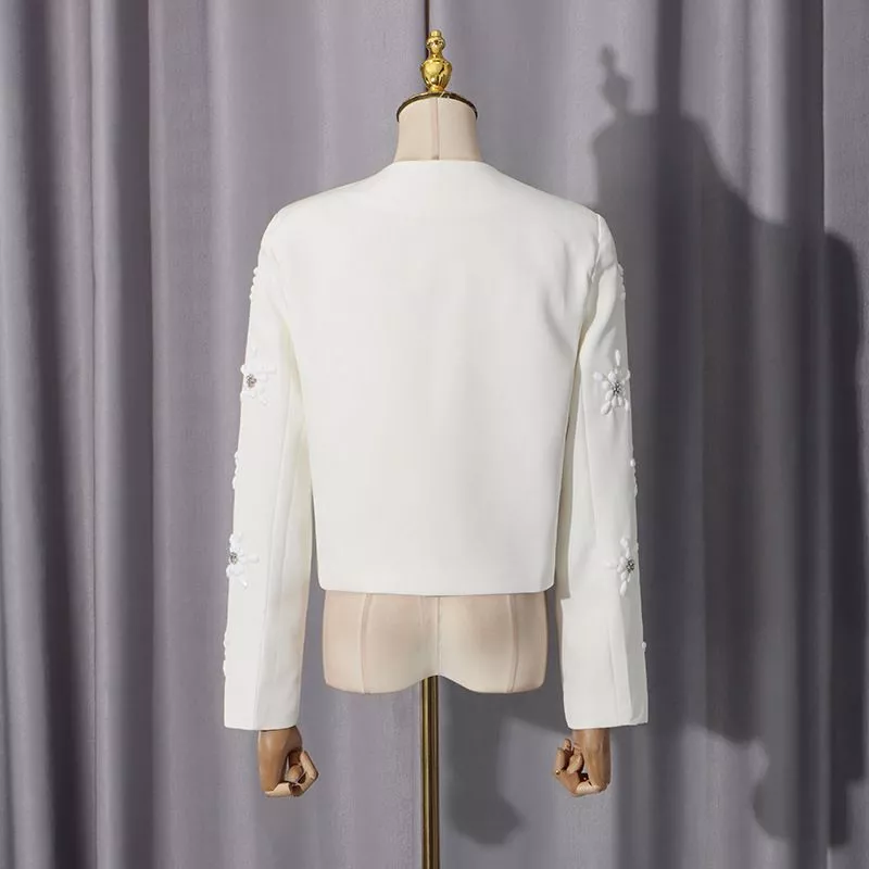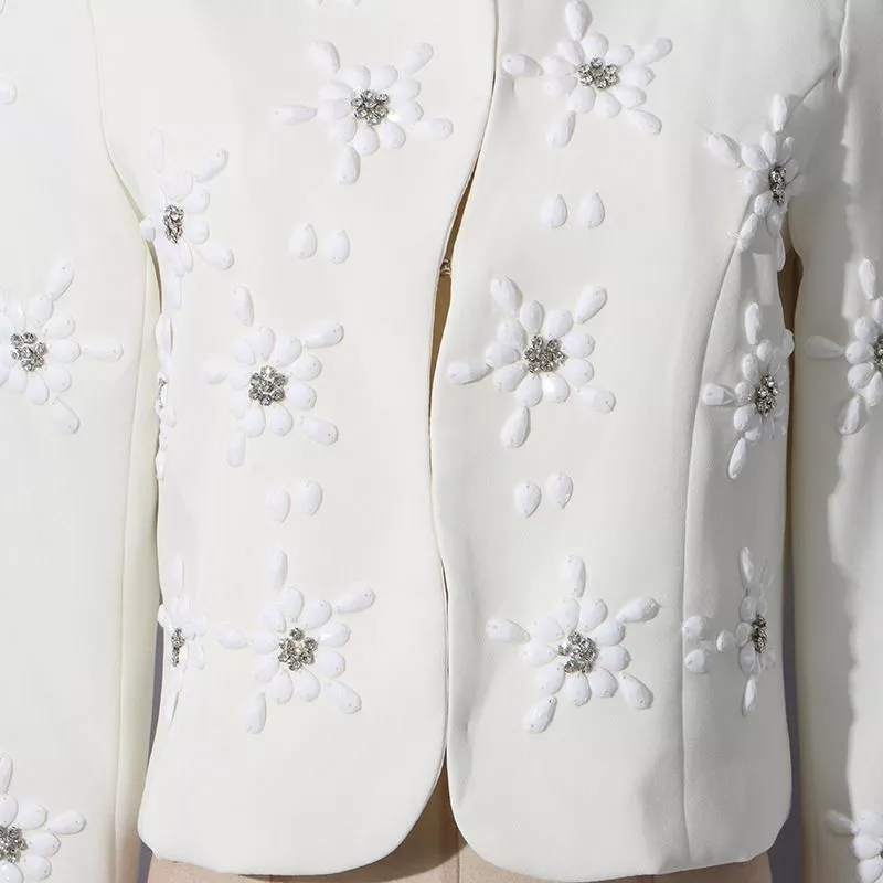 Completo donna elegante composto da giacca corta strutturata con applicazioni floreali tridimensionali tono su tono e pantalone palazzo a vita alta. Un tailleur raffinato e moderno, perfetto per cerimonia, evento formale o occasione speciale. La linea pulita e le decorazioni delicate rendono questo outfit sofisticato e femminile, ideale per chi desidera un look elegante e contemporaneo.