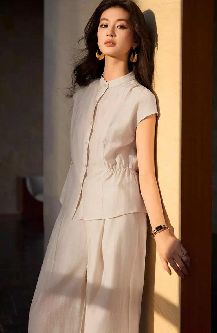 Completo donna elegante composto da blusa fluida con abbottonatura frontale e pantalone palazzo coordinato. Il design minimal e raffinato valorizza la silhouette creando un look perfetto per ufficio, lavoro e occasioni formali. La linea morbida e il taglio pulito rendono l'outfit femminile, moderno e facile da abbinare per uno stile professionale contemporaneo.