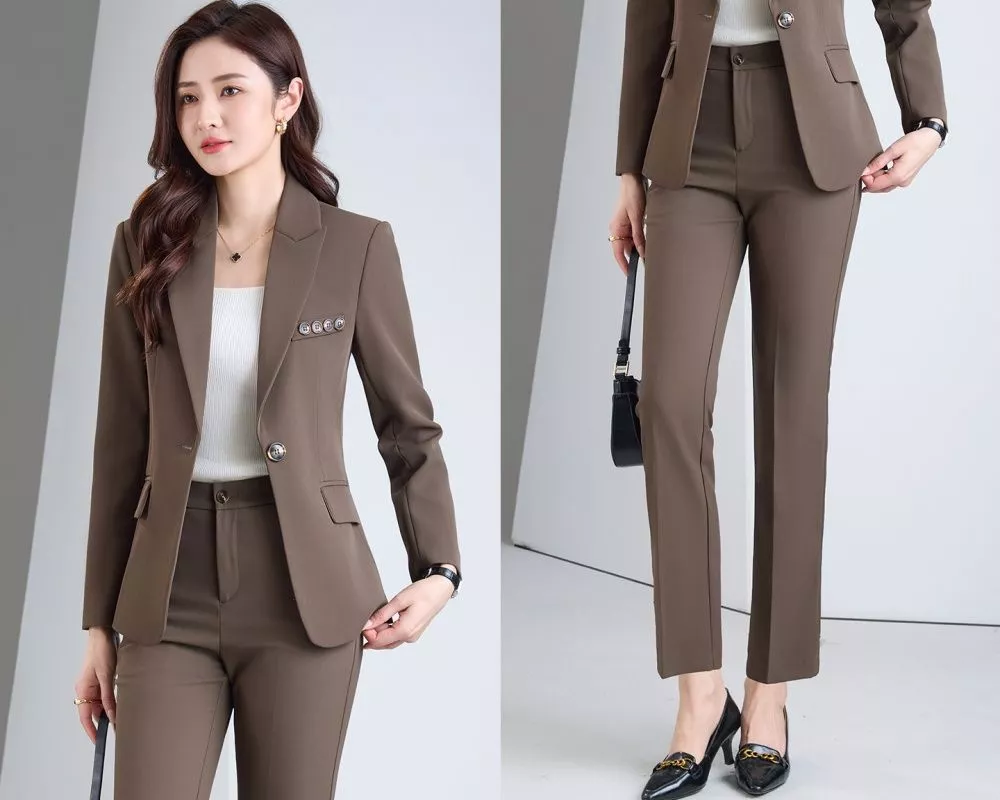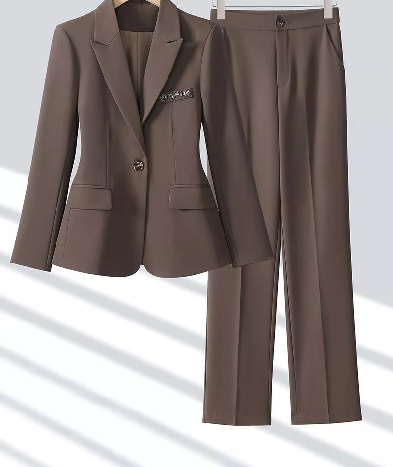 Tailleur Donna Elegante Blazer Classico E Pantalone Dritto Marrone CF66840