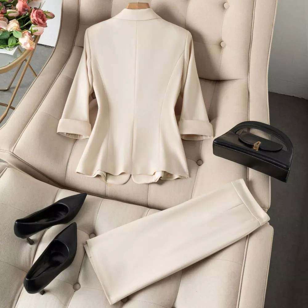 Un completo elegante e versatile che unisce stile professionale e femminilità, perfetto per chi desidera un outfit sofisticato e facile da abbinare.