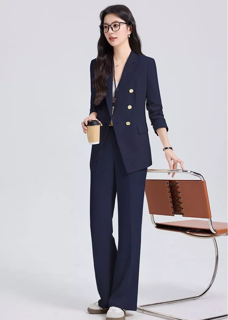 Completo donna elegante composto da blazer doppiopetto con bottoni dorati e pantaloni palazzo coordinati. Il taglio sartoriale valorizza la silhouette mantenendo uno stile professionale moderno e raffinato. La giacca strutturata con rever classico dona carattere all'outfit mentre i pantaloni a gamba ampia assicurano comfort e libertà di movimento. Un completo ideale per ufficio, riunioni e occasioni formali in cui si desidera un look curato e contemporaneo.
