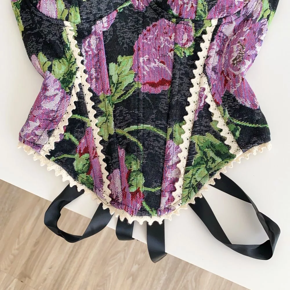 Top corsetto donna dal forte impatto estetico, realizzato in tessuto jacquard decorato con motivo floreale e rifinito da inserti in pizzo che valorizzano la silhouette. La struttura sagomata con stecche interne dona un effetto modellante elegante, esaltando il punto vita in modo armonioso.