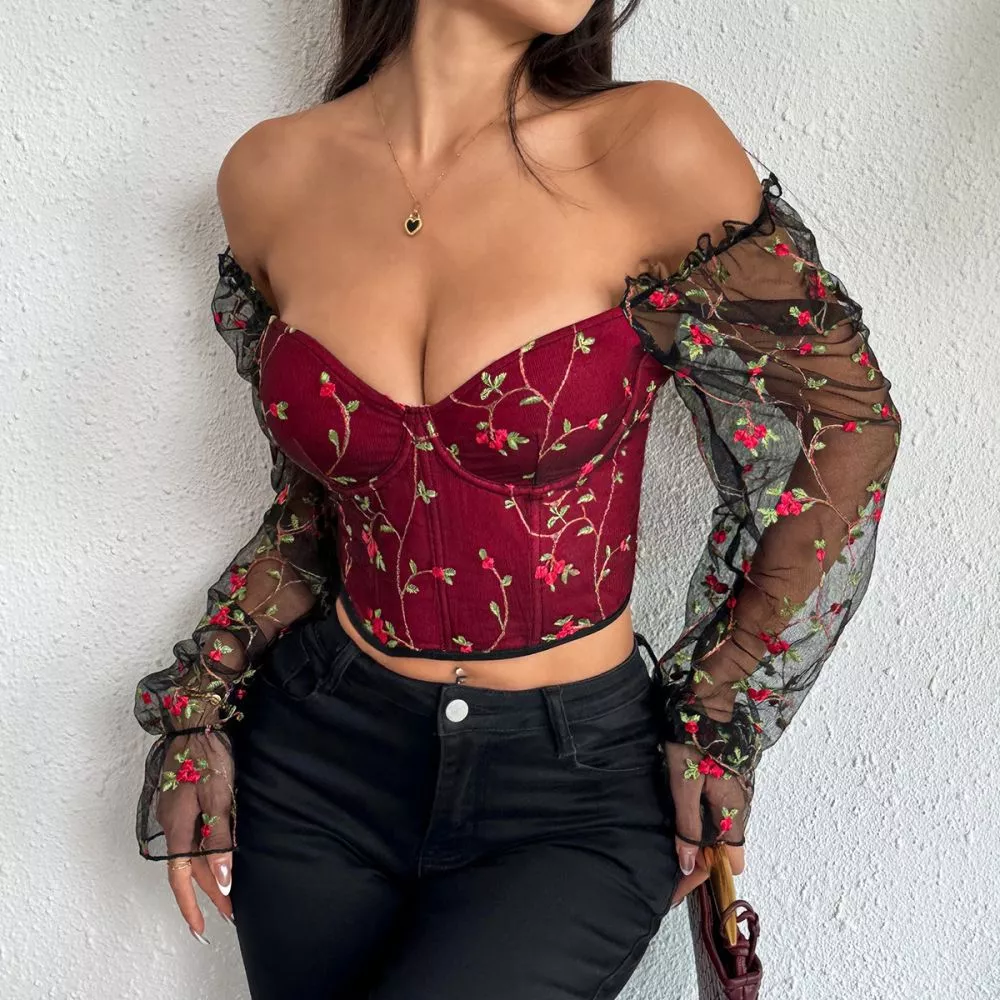 Corsetto donna dal design romantico e sofisticato, caratterizzato da ricami floreali delicati su base strutturata che valorizza la silhouette. Le maniche in tulle trasparente con lavorazione ricamata aggiungono leggerezza e un effetto scenografico di forte impatto visivo.