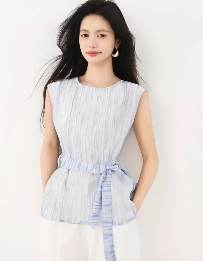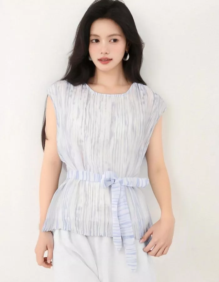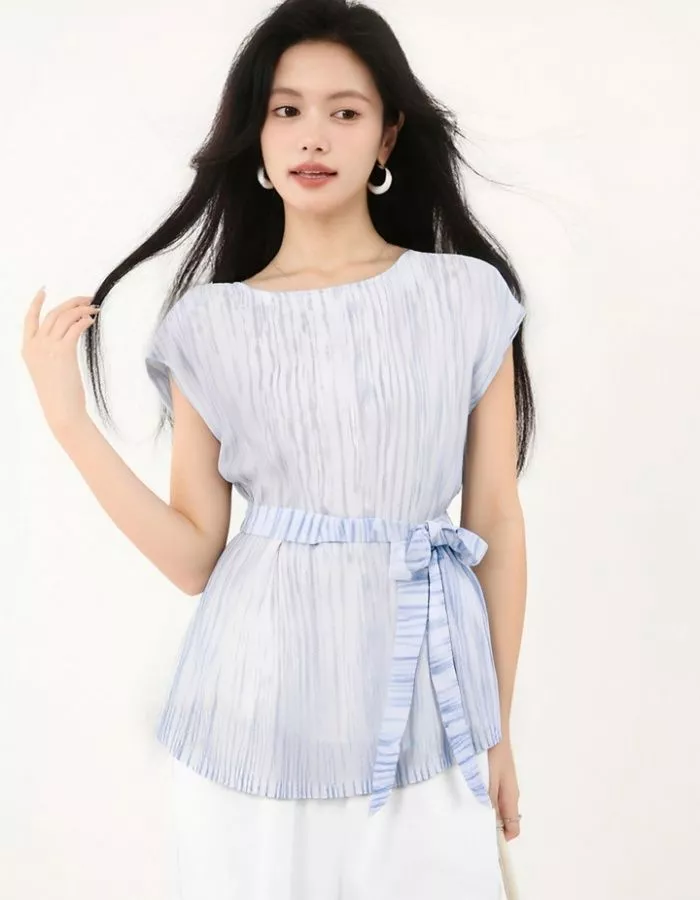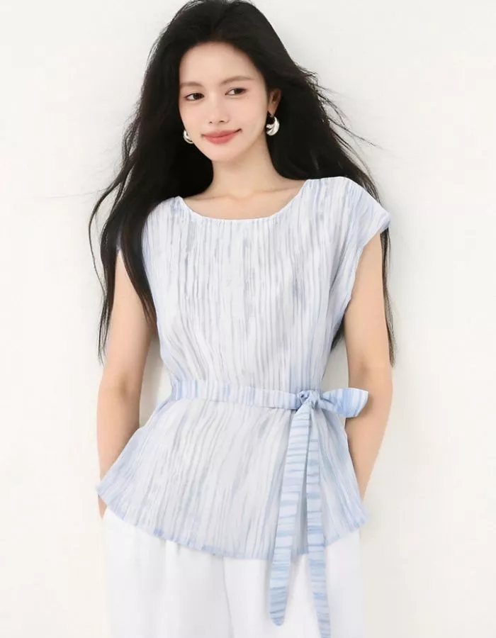 Top Estivo A Righe Azzurre Con Fiocco In Vita E Maniche Corte Eleganti CF47429
