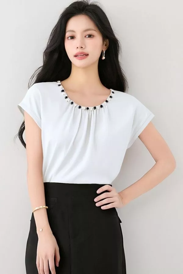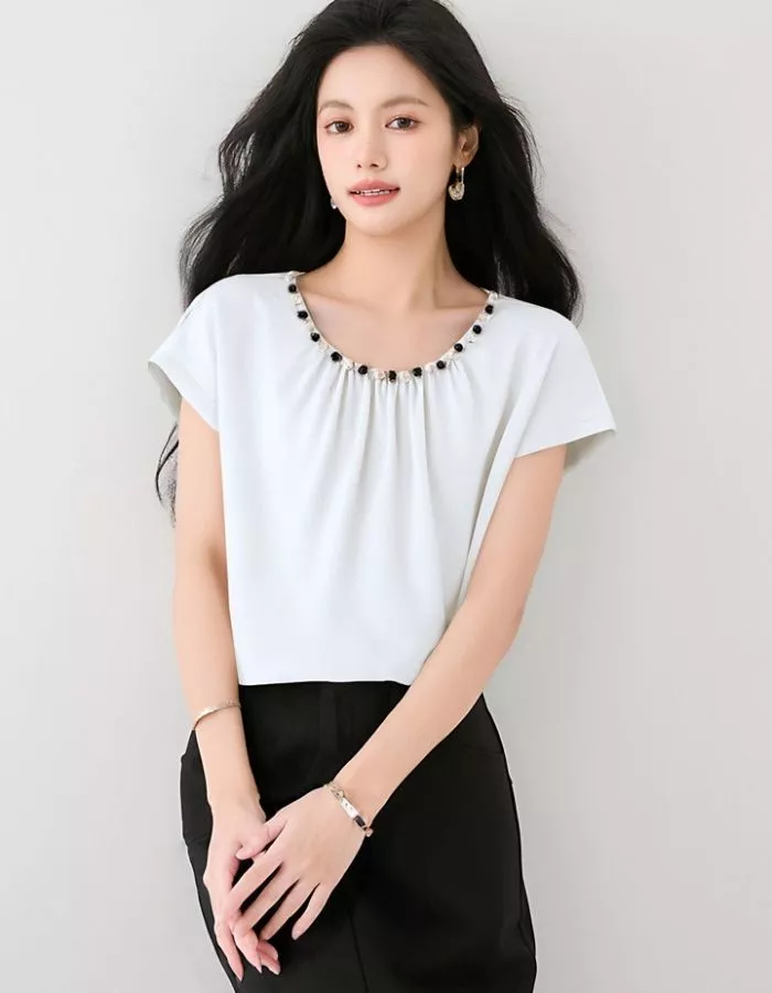 Dona un tocco sofisticato e luminoso ai tuoi outfit con questo top estivo raffinato, perfetto per creare look eleganti e femminili. Lo scollo rotondo è impreziosito da perline decorative in rilievo che catturano la luce con discrezione, mentre il taglio morbido e la linea arricciata assicurano comfort e vestibilità impeccabile. Ideale per l’ufficio, eventi informali, o serate chic.