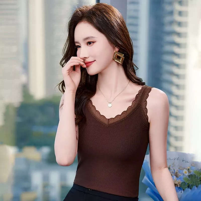 Top Marrone Donna Estivo Scollo V Con Pizzo Maglia Elasticizzata Elegante F45381