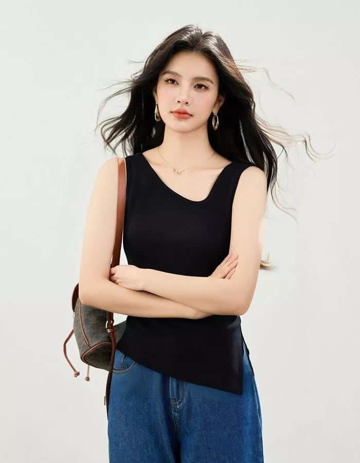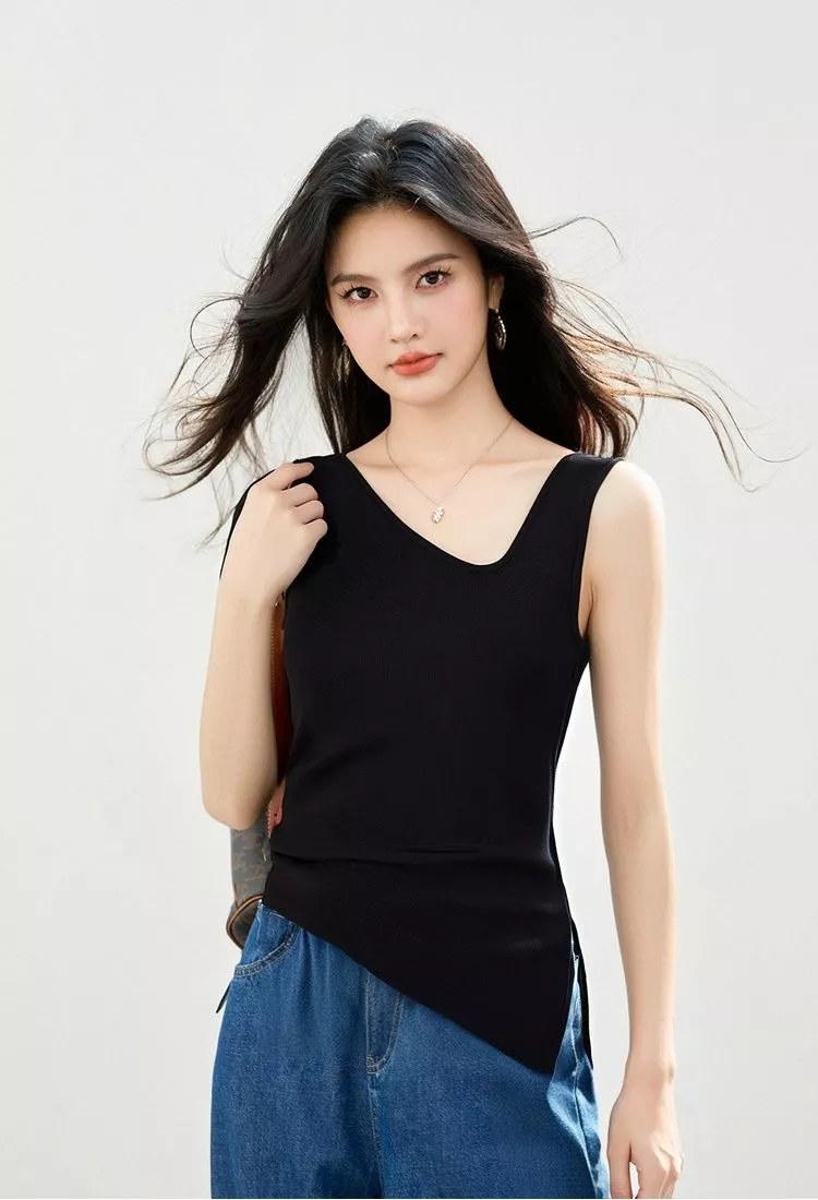 Questo top senza maniche dallo stile asimmetrico è la scelta ideale per la stagione estiva. Il design con scollo a V e il taglio laterale obliquo donano un tocco moderno e ricercato, valorizzando la silhouette con eleganza. Realizzato in tessuto lavorato a maglia sottile e leggero, garantisce comfort e freschezza anche durante le giornate più calde. Perfetto sia per look casual che per occasioni più chic, può essere facilmente abbinato a jeans, pantaloni o gonne per un outfit sempre impeccabile.