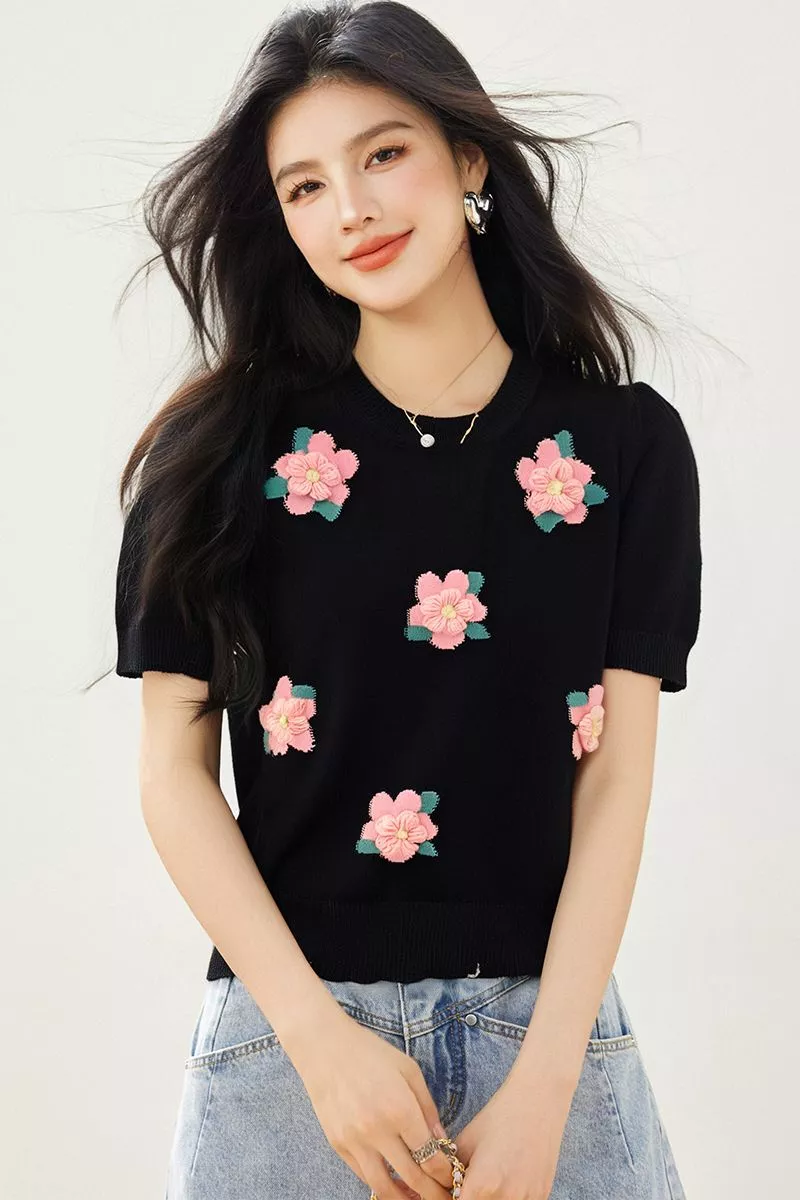 Top Nero Estivo In Maglia Slim Fit Con Fiori Ricamati In Rilievo CF40666
