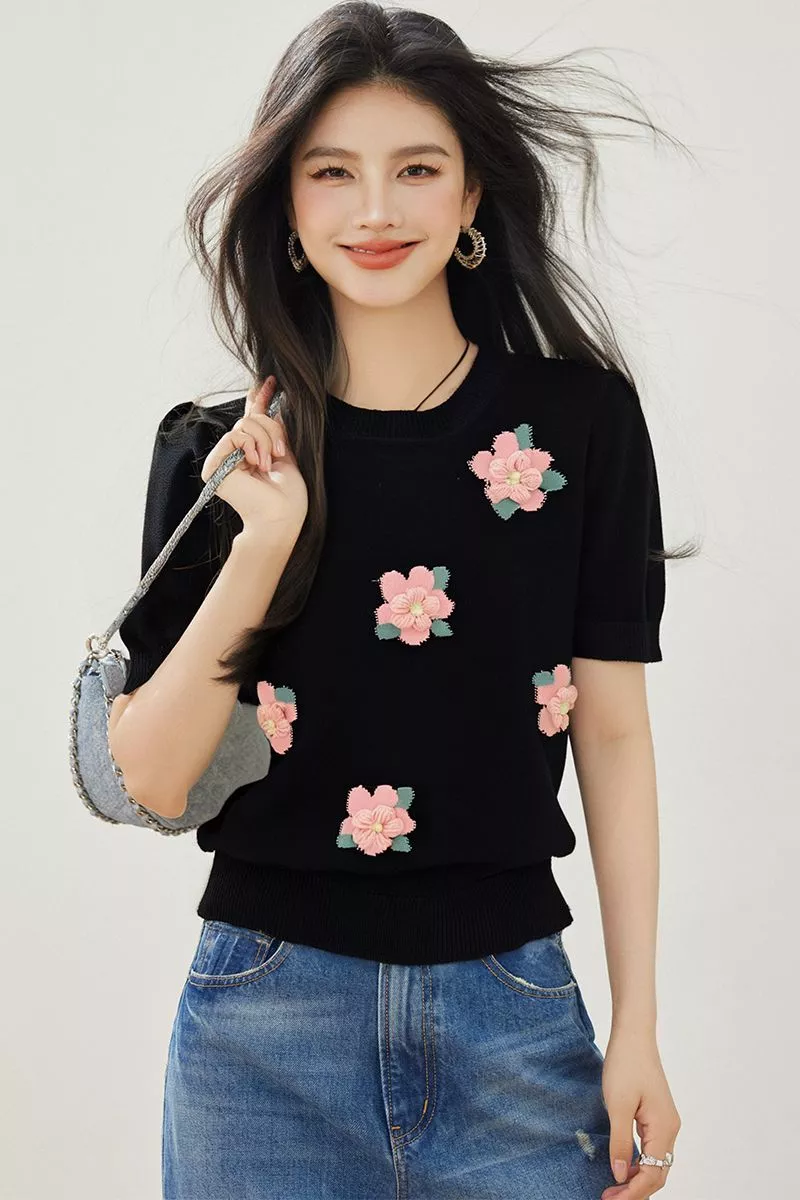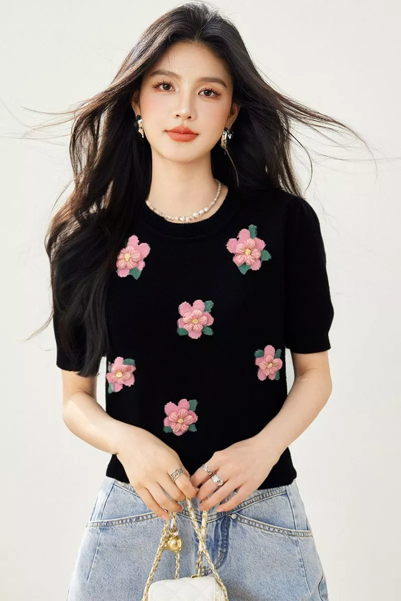 top estivo da donna in maglia sottile e leggera, arricchito da dettagli floreali ricamati in rilievo che aggiungono un tocco romantico e raffinato. Il taglio aderente e lo scollo rotondo lo rendono perfetto per essere indossato con jeans, gonne o pantaloni eleganti durante le giornate più calde.