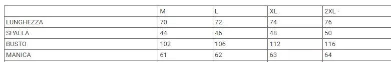 | Taglia | Lunghezza | Spalla | Busto | Manica |
