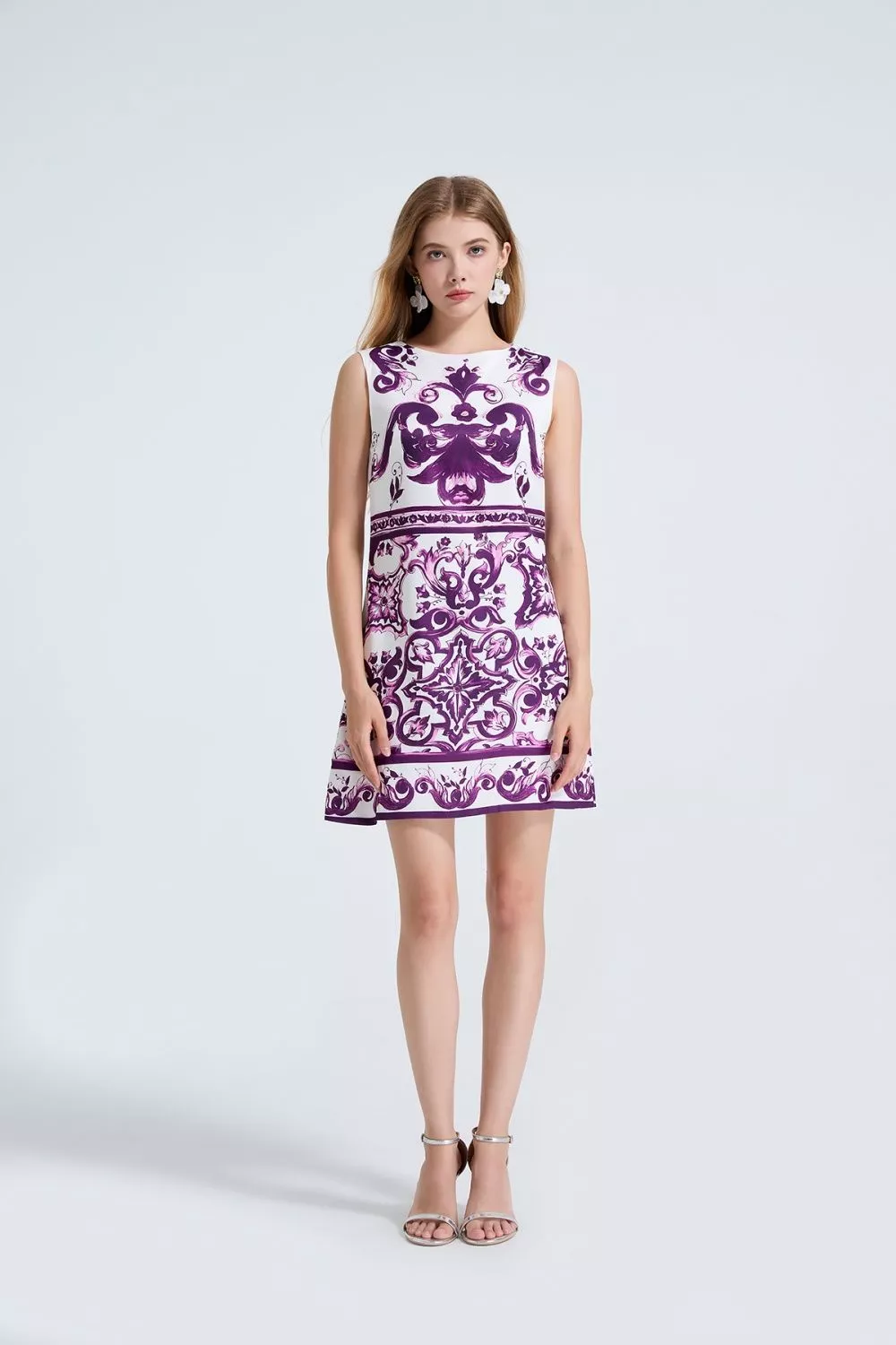 Vestito Porpora Con Stampa Barocca Elegante Senza Maniche Estivo CF54965