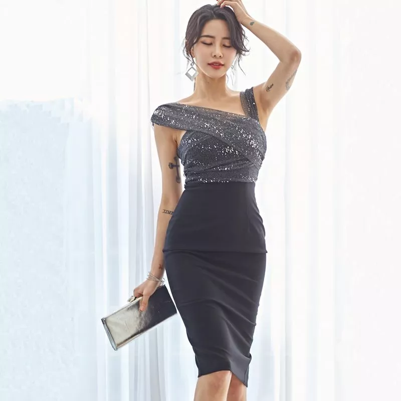 Tubino Donna Nero Elegante Scollo Asimmetrico Con Drappeggio Luminoso CF64557