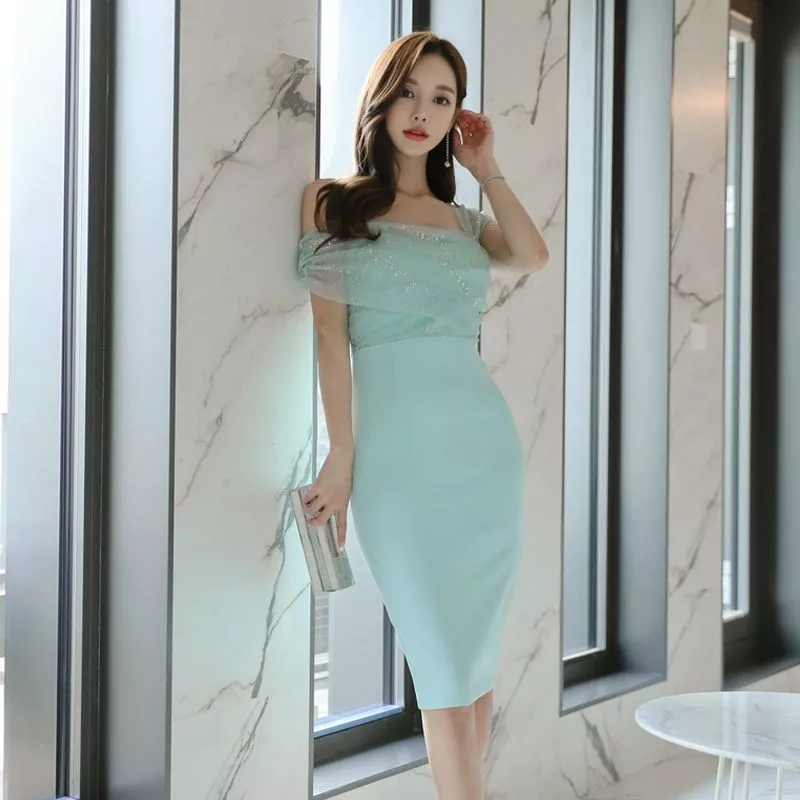 Tubino Donna Verde Acqua Elegante Scollo Asimmetrico Drappeggiato CF64557