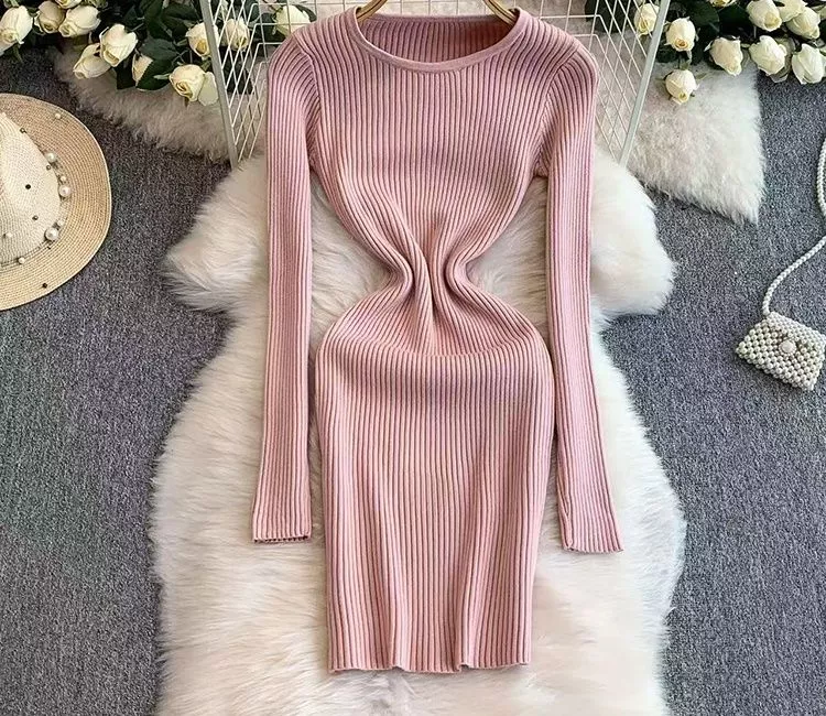 Mini Vestito Maglia Aderente Rosso Rosa Maniche Lunghe Seducente CF59660
