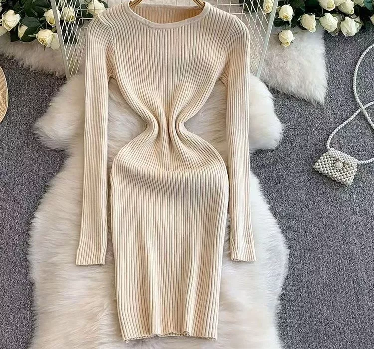 Vestito Corto Maglia Aderente Beige Maniche Lunghe Neutro Raffinato CF59660