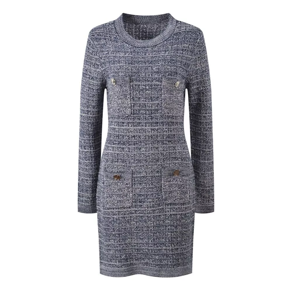 Vestito Donna Tweed Blu Navy Elegante Aderente Maniche Lunghe E Bottoni CF61325