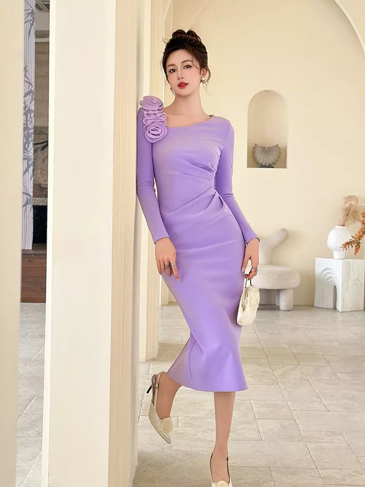 Abito Midi Donna Viola Elegante Aderente Con Maniche Lunghe Slim CF61355