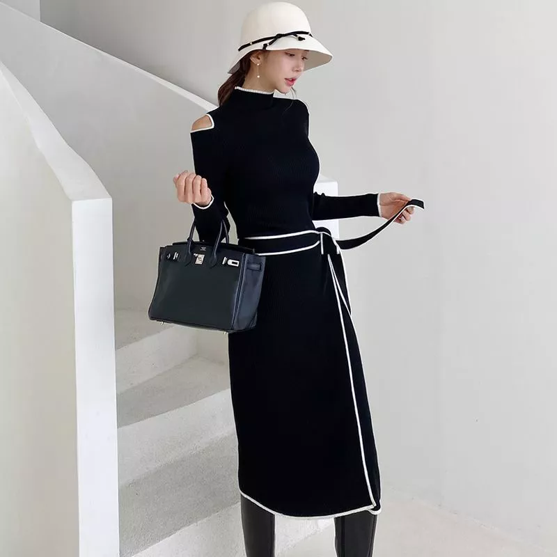 Tubino Donna Nero A Maglia Midi Con Maniche Lunghe Linea Aderente CF62263
