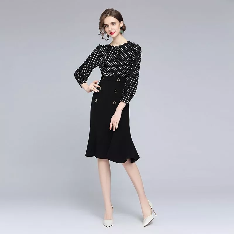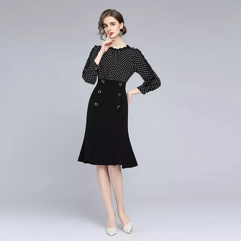 Abito nero a pois con vita alta e bottoni decorativi dorati, dal taglio midi e maniche lunghe.