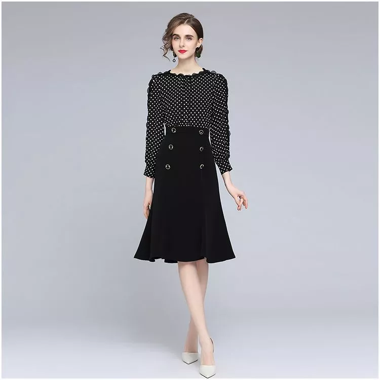 La parte superiore presenta una fantasia a pois bianca su fondo nero, mentre la gonna svasata dona movimento e femminilità.