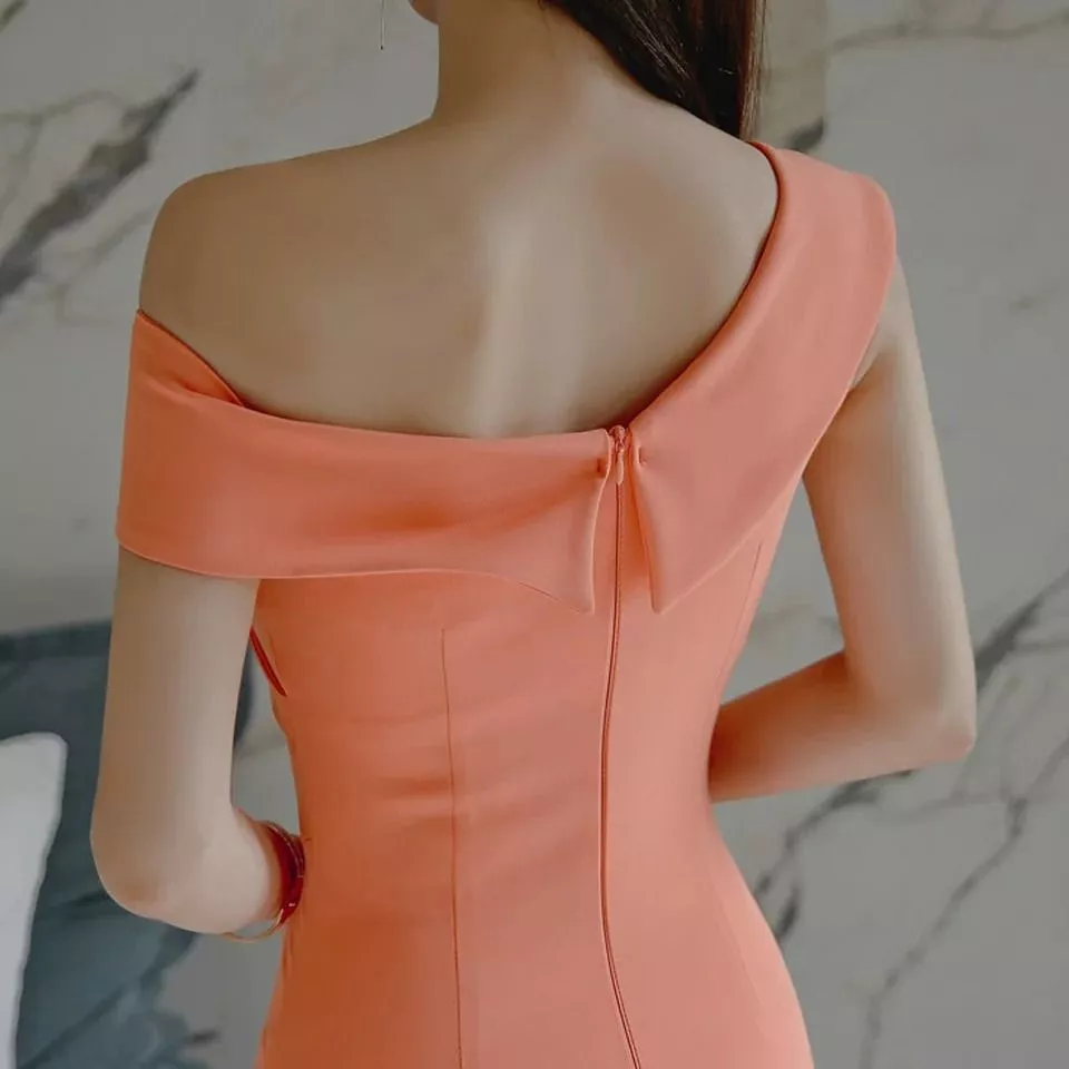 Tubino Corto Asimmetrico Monospalla Color Pesca Chiaro Drappeggio Donna KL6561