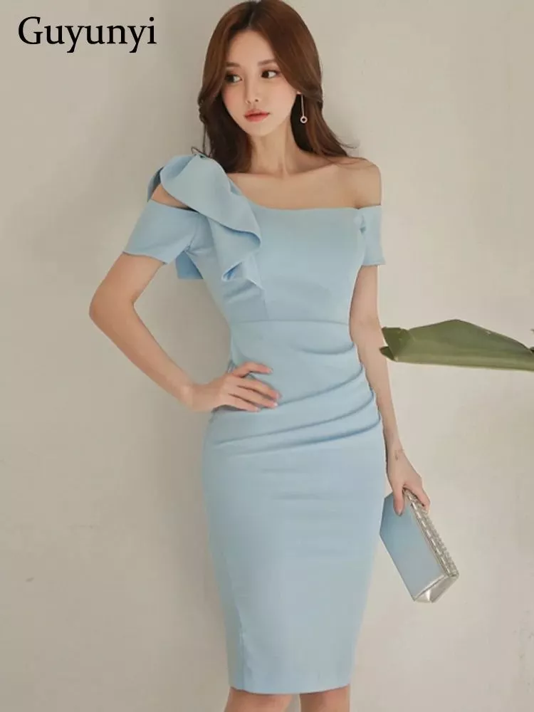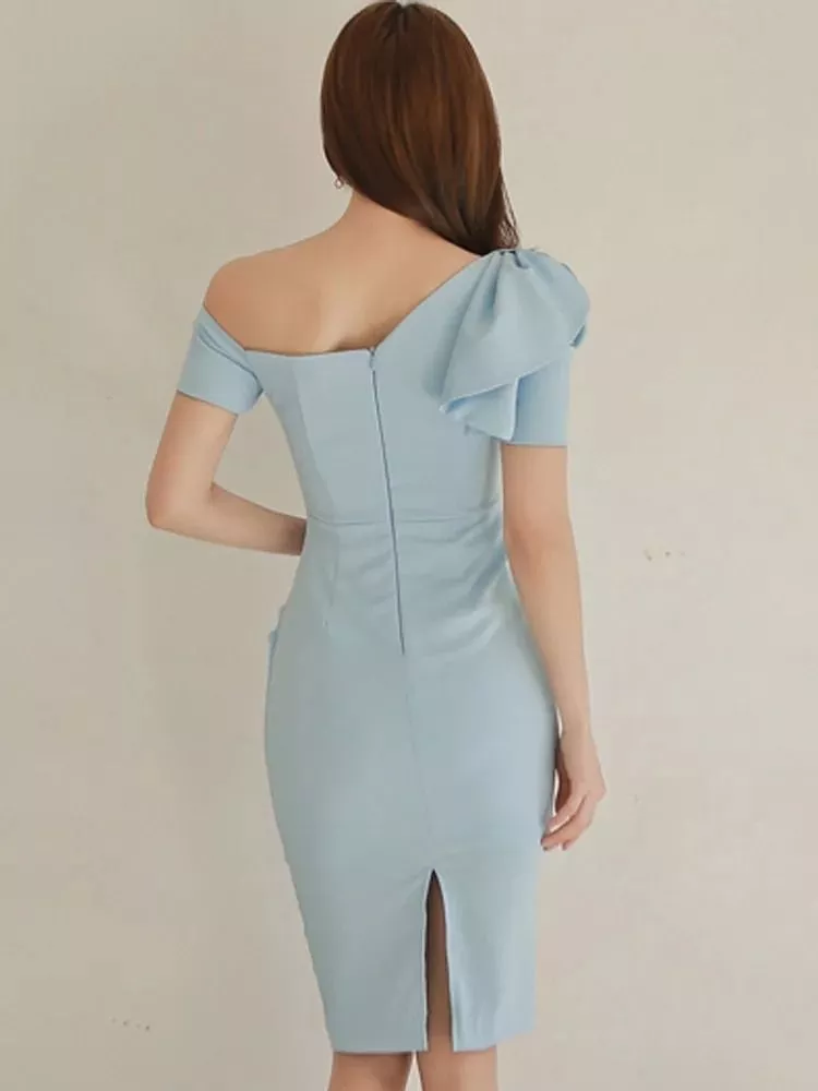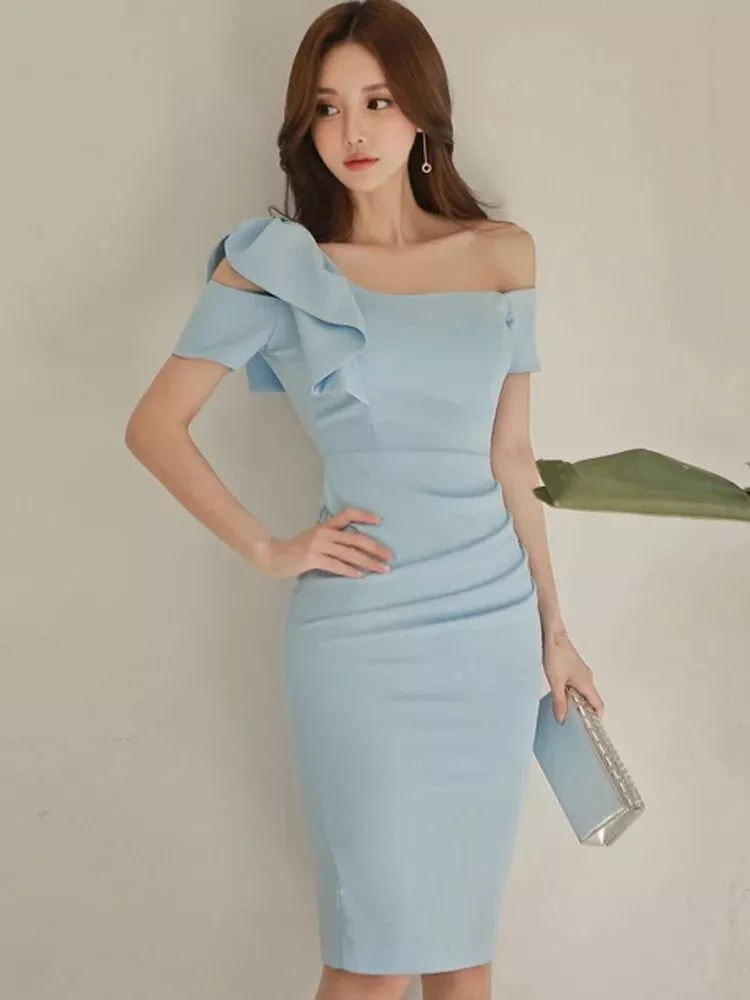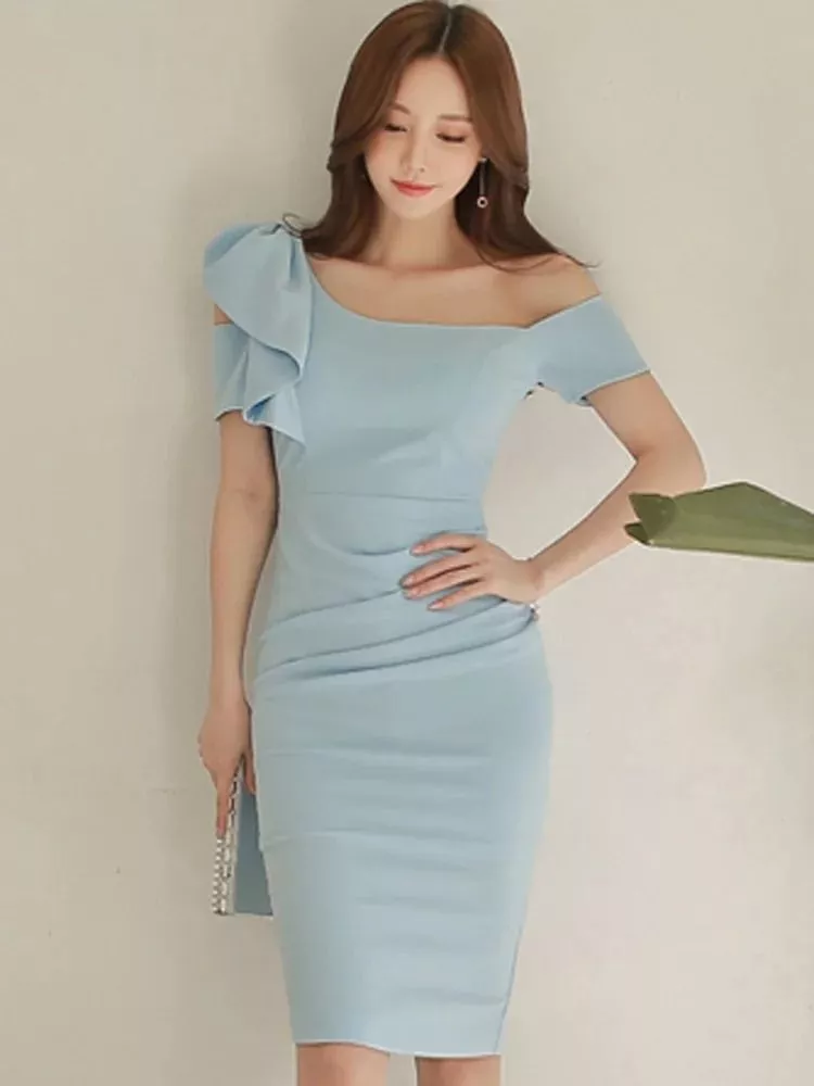 Tubino Midi Aderente Azzurro Monospalla Con Volant Elegante Donna KL6556