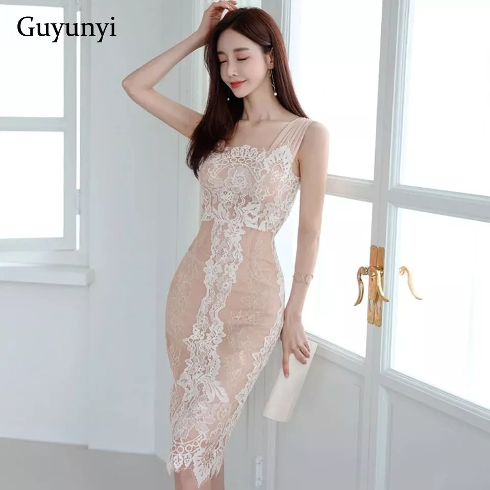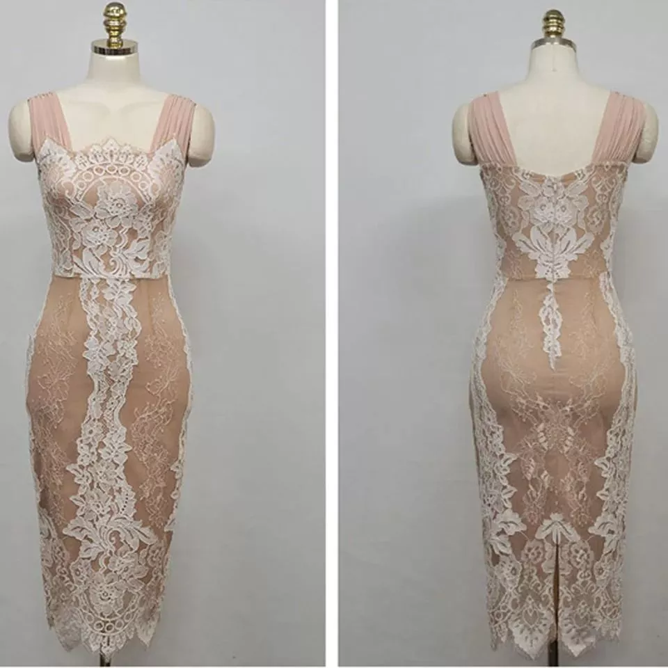 Tubino Midi Aderente Beige in Pizzo Trasparente Spalline Drappeggiate KL6567