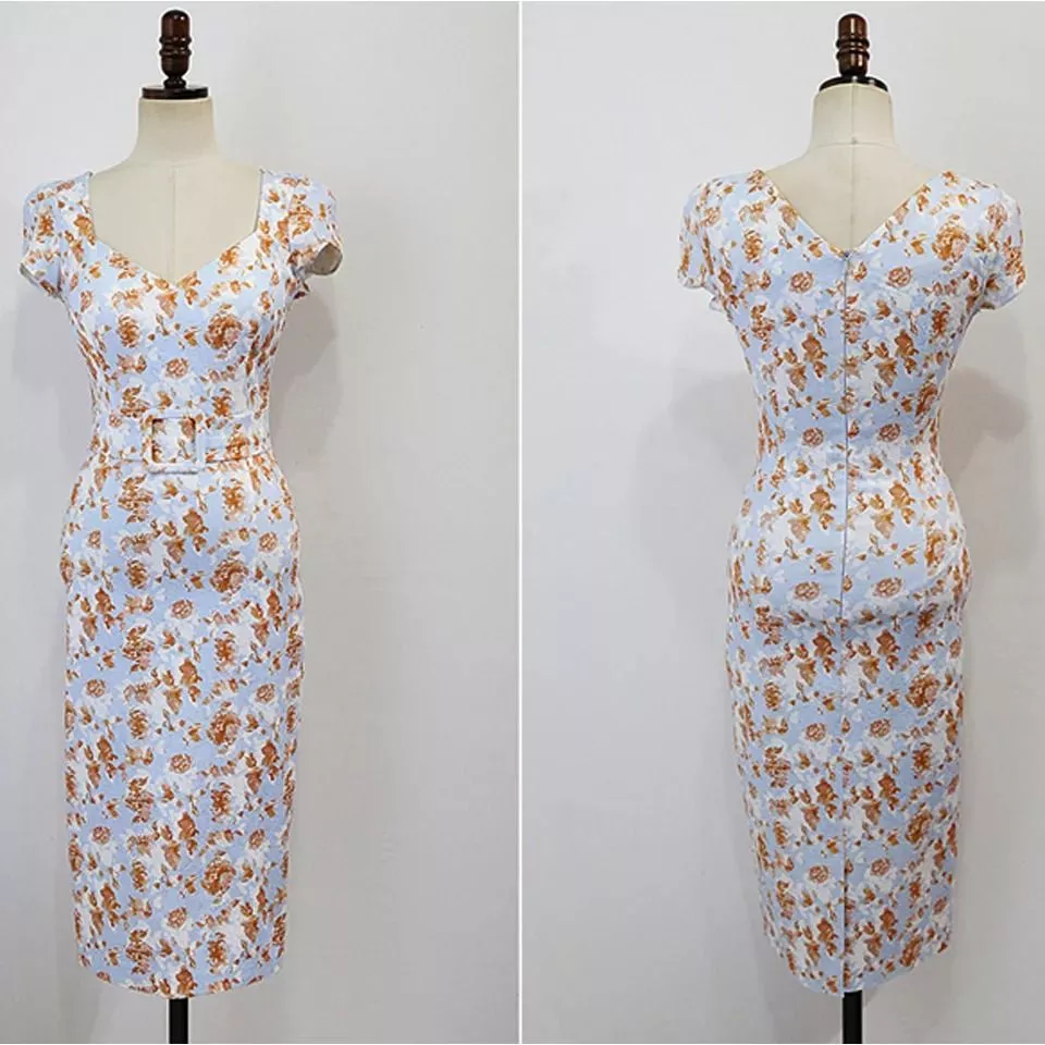 La stampa floreale su base bianca, con tonalità arancio, lavora su contrasto e distribuzione: rompe la monotonia della superficie e rende il capo visivamente più dinamico. Questo lo sposta automaticamente verso un utilizzo stagionale e meno formale rispetto a un tubino monocromatico.