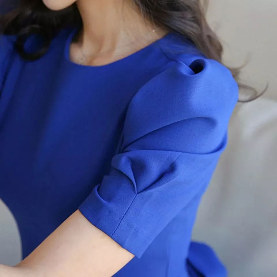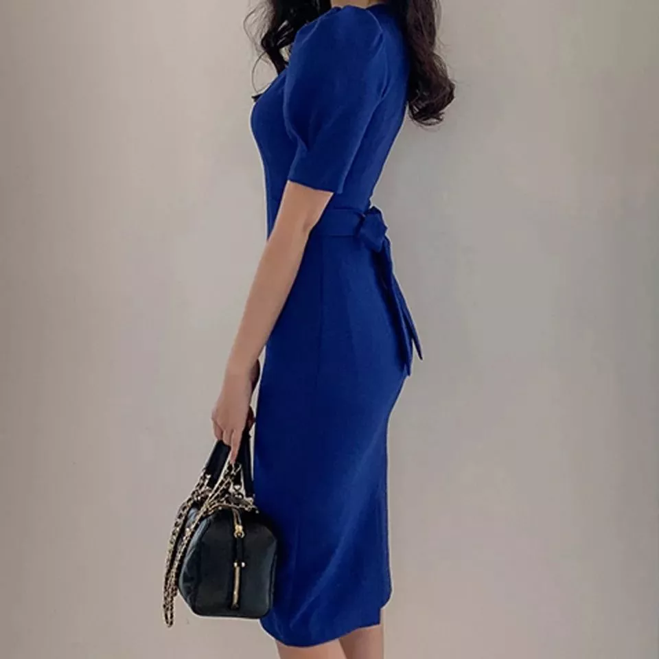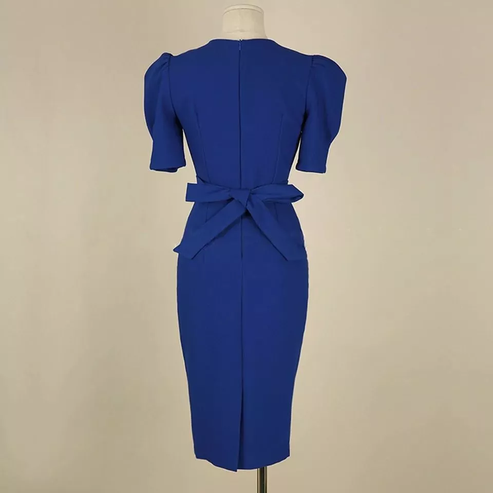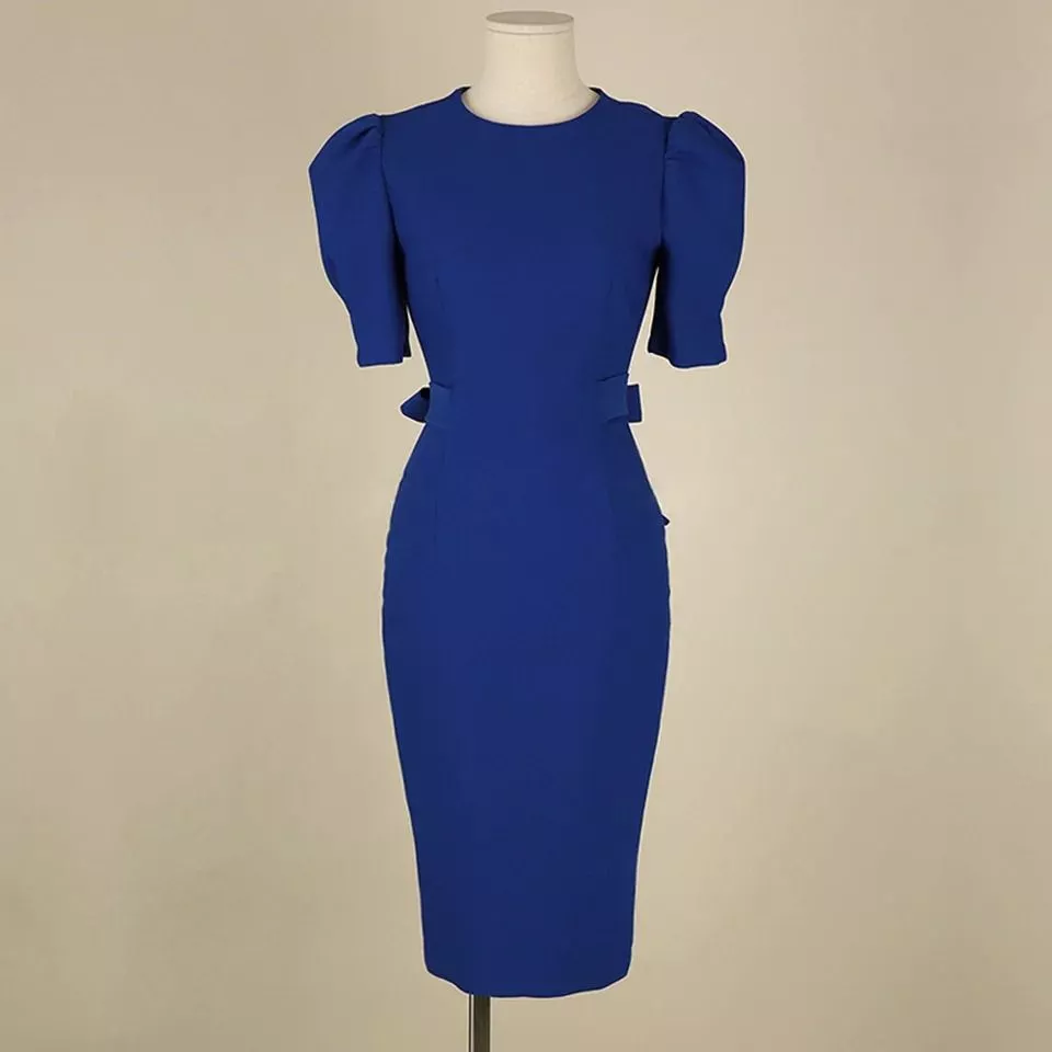 Tubino Midi Aderente Blu Elettrico con Maniche Palloncino Donna KL6563
