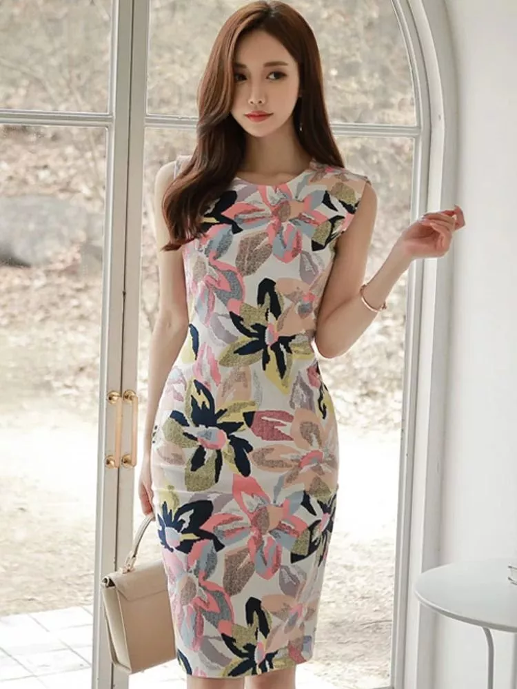 Tubino Midi Aderente Floreale Senza Maniche Elegante Donna KL6555