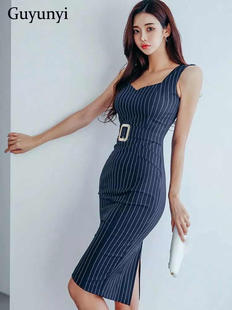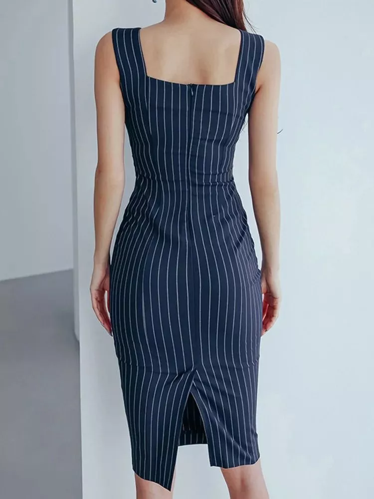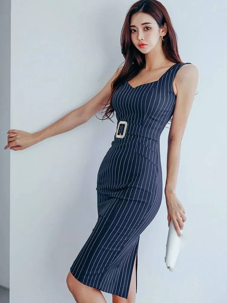 Tubino Midi Aderente Gessato Blu Con Cintura Elegante Donna KL6557