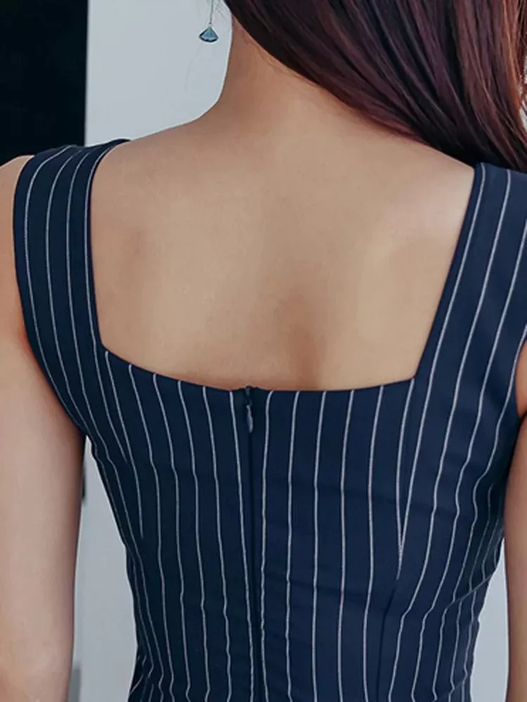 La fantasia gessata verticale non è un elemento estetico neutro: crea un effetto ottico di slancio che allunga visivamente la figura e riduce la percezione delle larghezze. Questo lo rende un capo più “tecnico” rispetto ai tubini lisci.