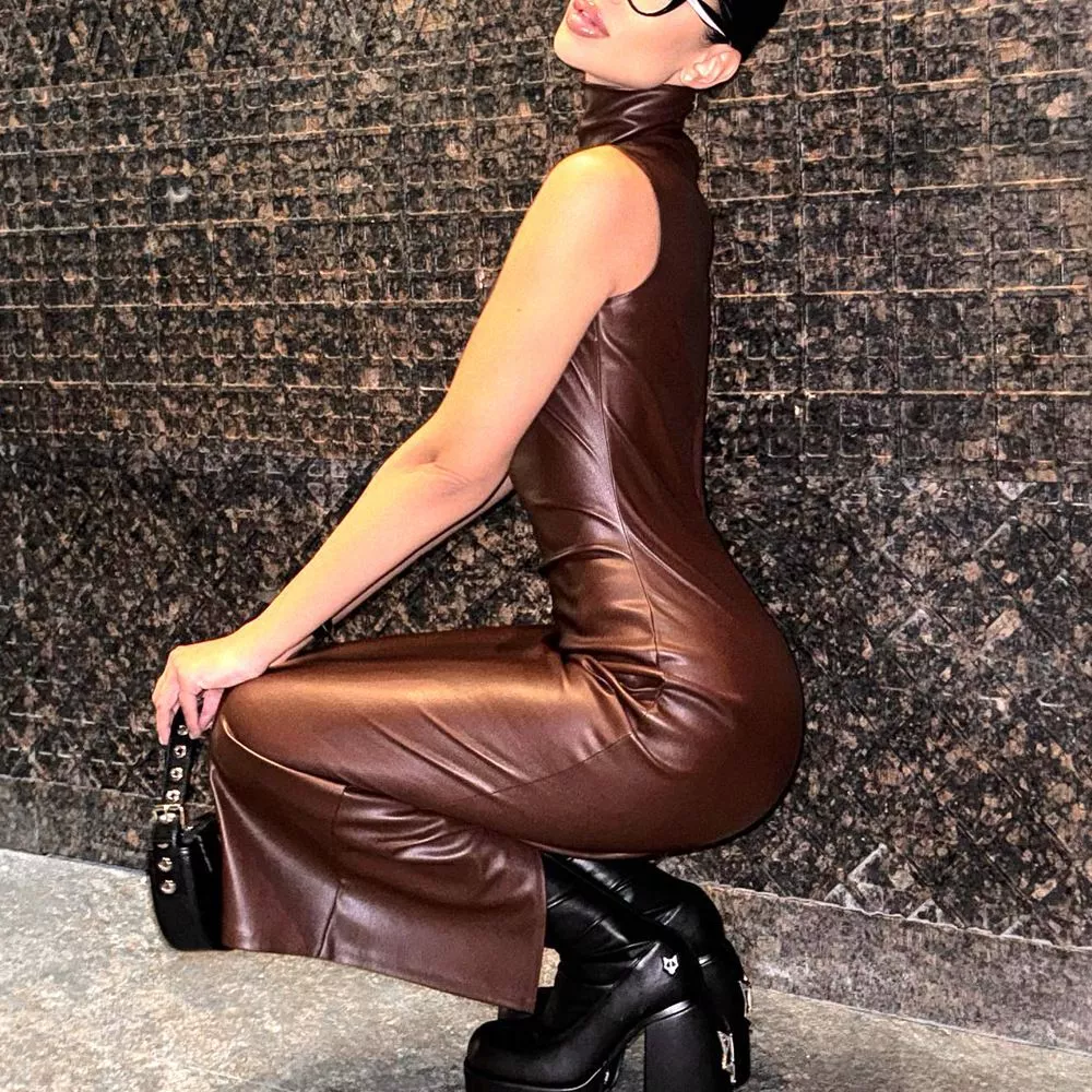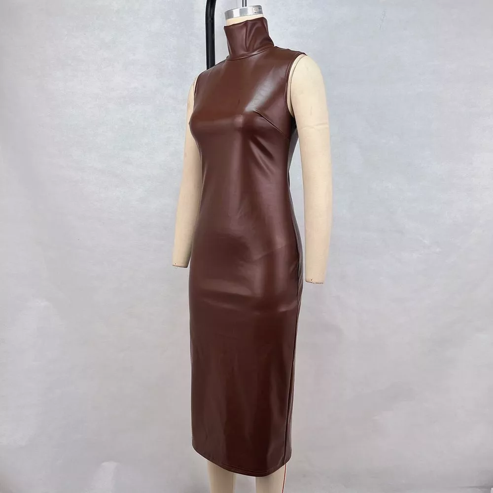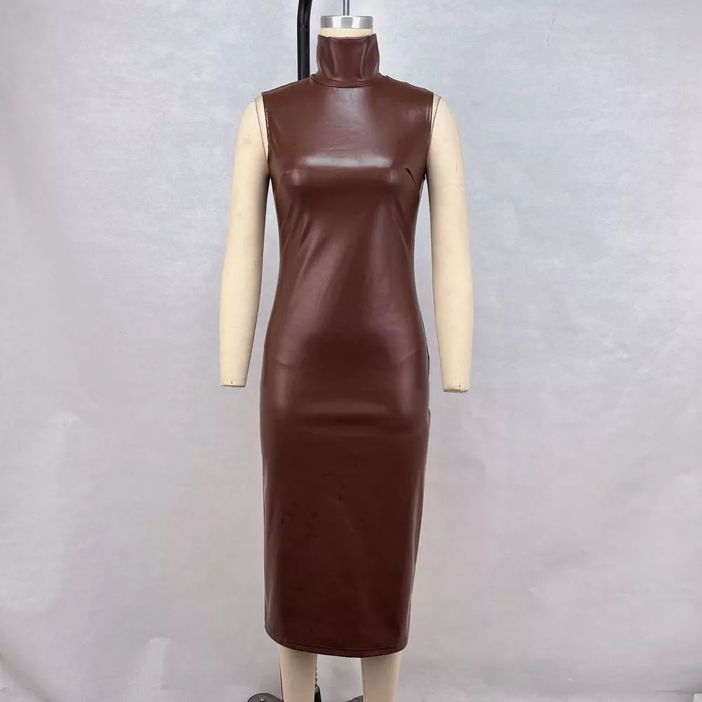 Tubino Midi Marrone Scuro Aderente Effetto Pelle Collo Alto Sera CF67335