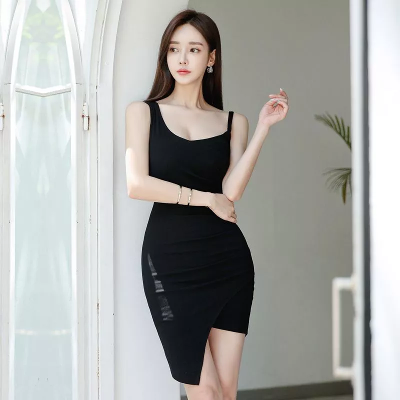 Tubino Nero Corto Elegante Con Spalline Sottili E Spacco Asimmetrico CF54849