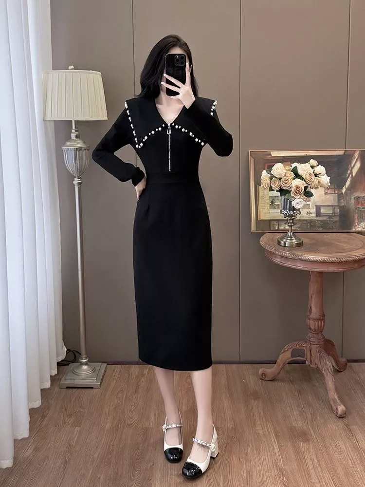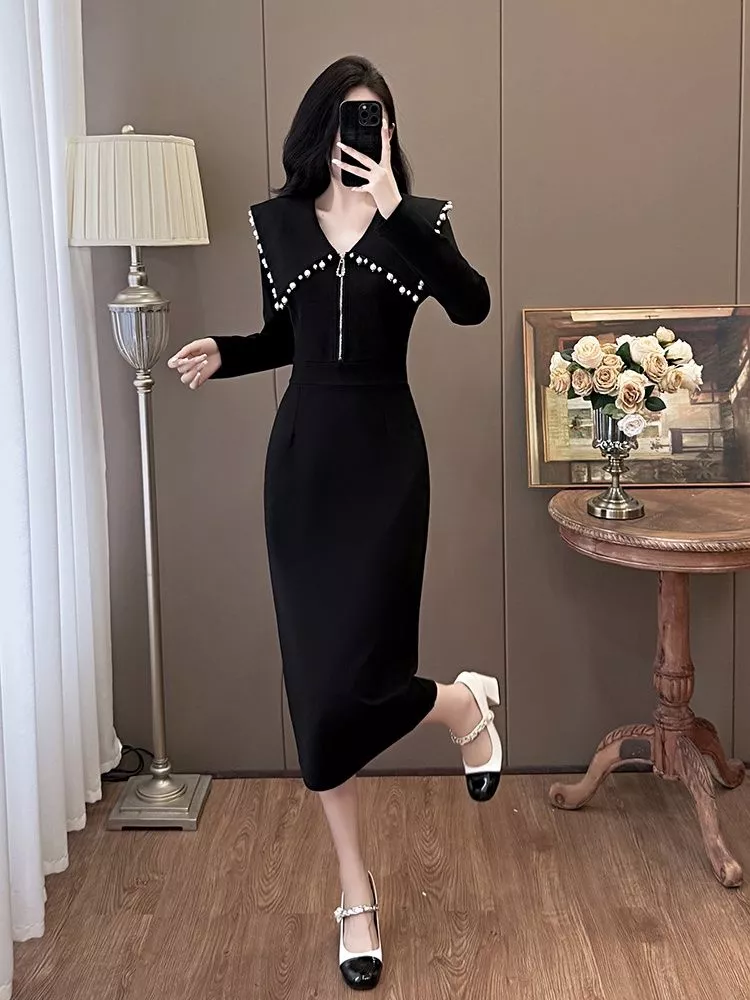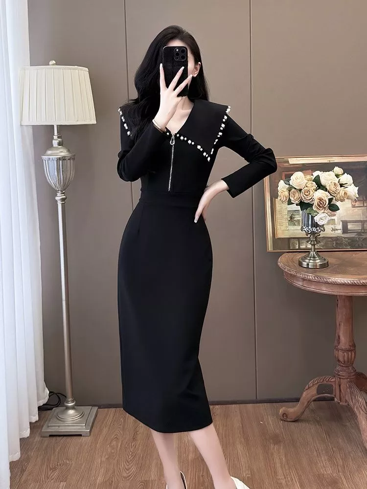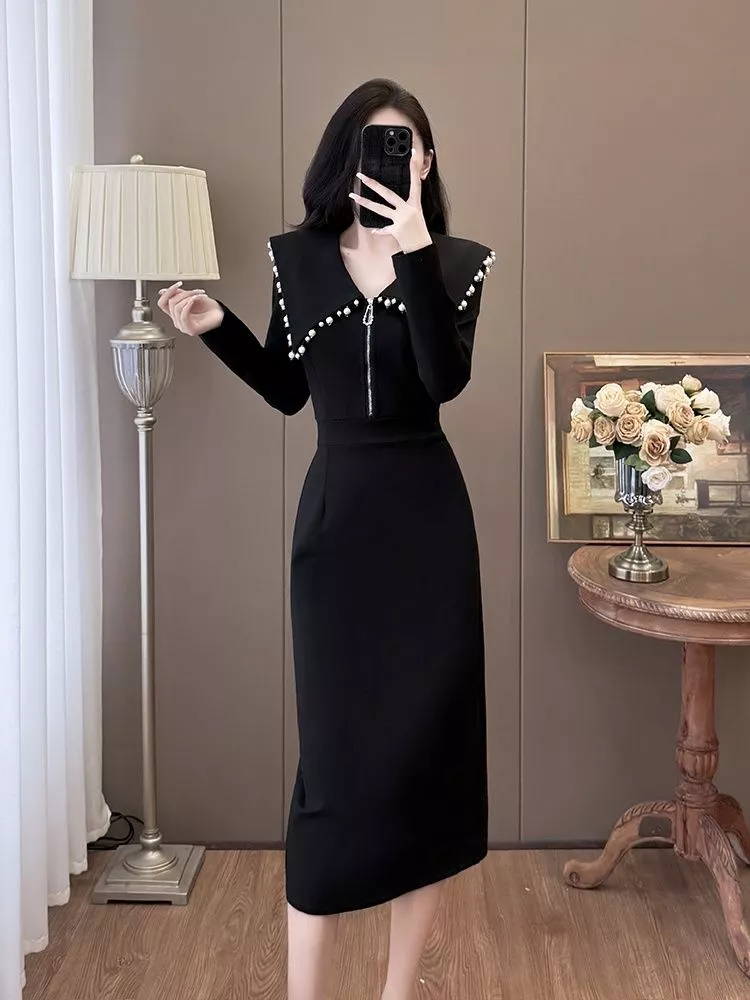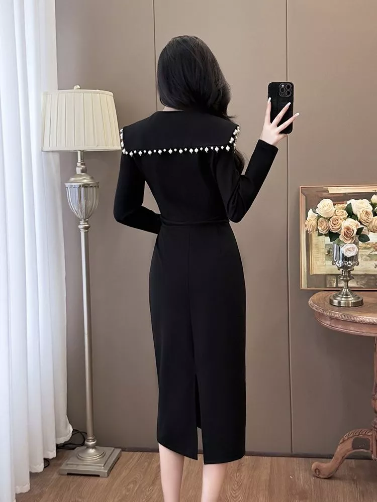 Tubino Nero Elegante Con Colletto Decorato Da Perle Stile Raffinato CF54872