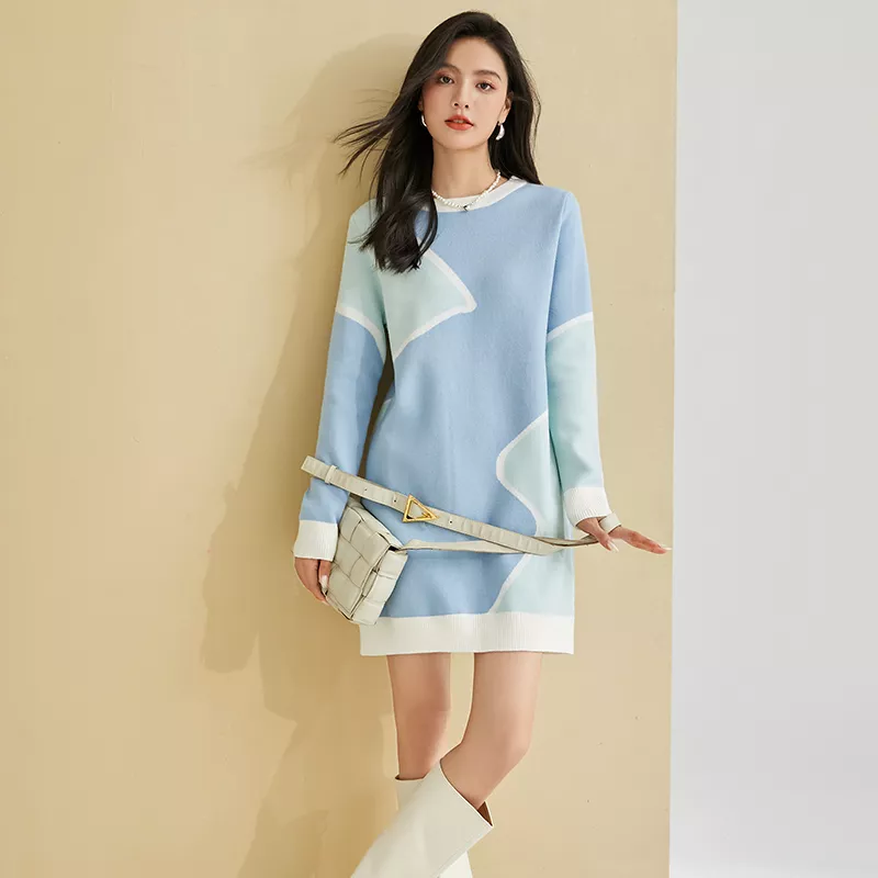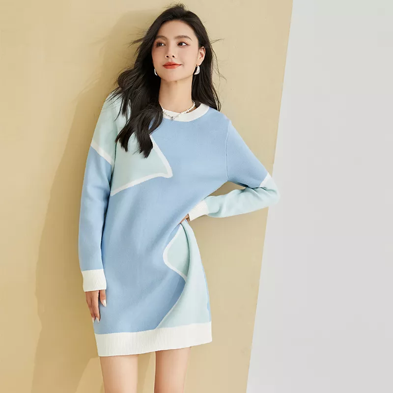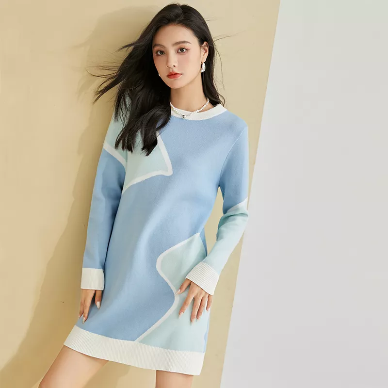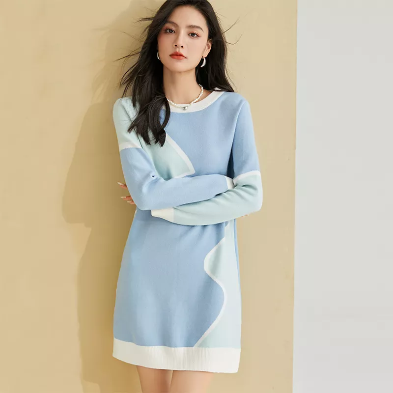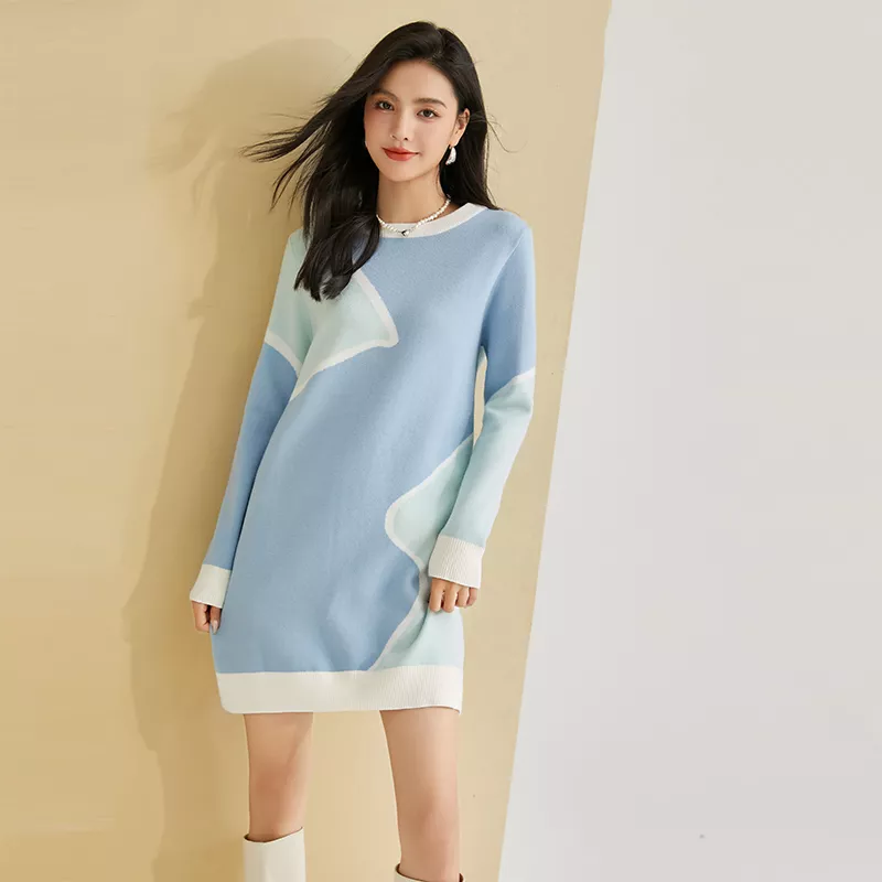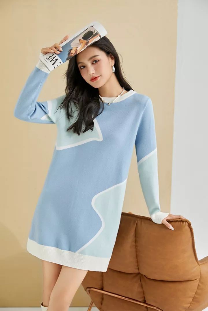 Tubino Vestito Abito Azzurro Bianco Morbido Elegante Manica Maglia 39877
