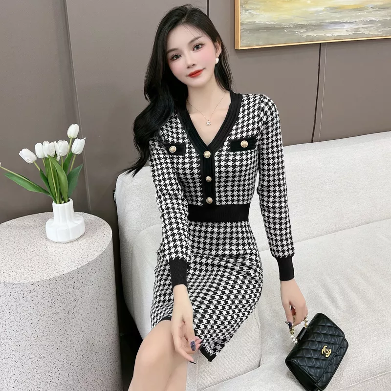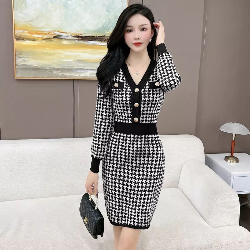 Tubino Vestito Abito Bianco Nero Scacchi Elegante Manica Elasticizzato 41405