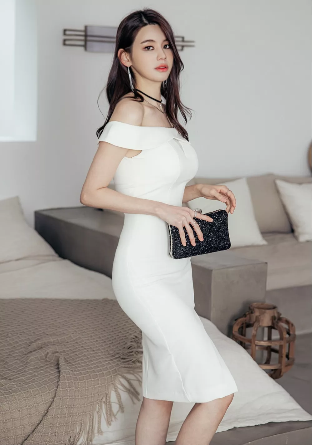 Tubino vestito abito donna elegante al ginocchio bianco spacco scollo D129