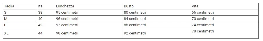 | Taglia | Ita | Lunghezza | Busto | Vita |