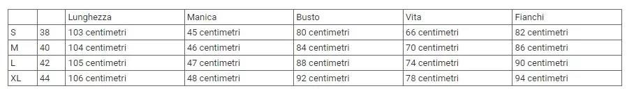 | XL | 44 | 106 centimetri | 48 centimetri | 92 centimetri | 78 centimetri | 94 centimetri |