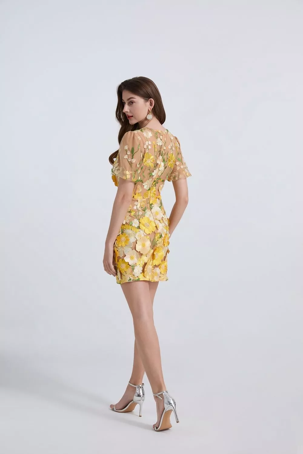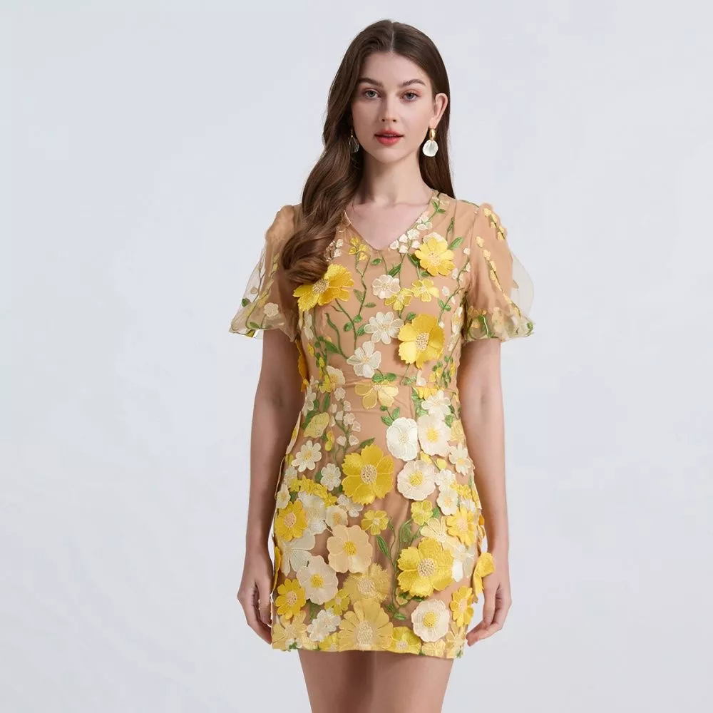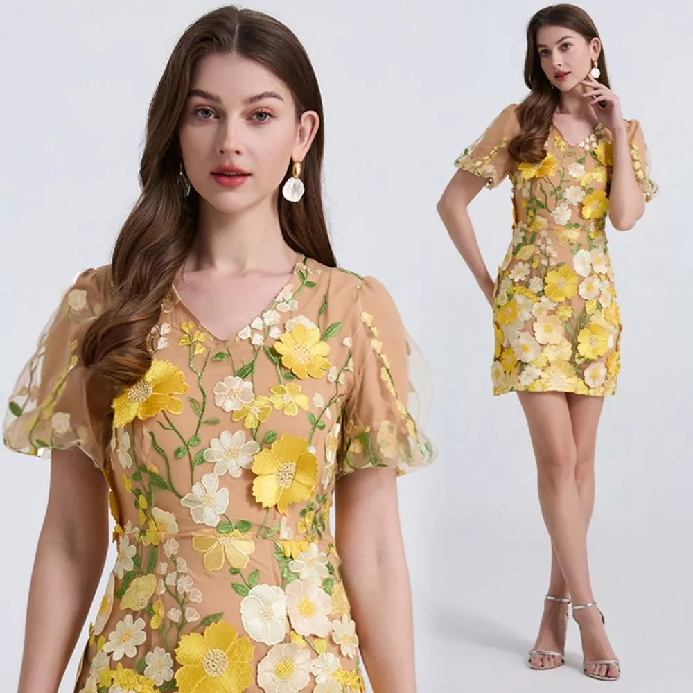 Tubino Vestito Abito Donna Elegante Manica Corta Giallo Mini Dress 39302
