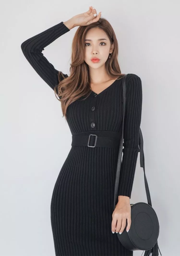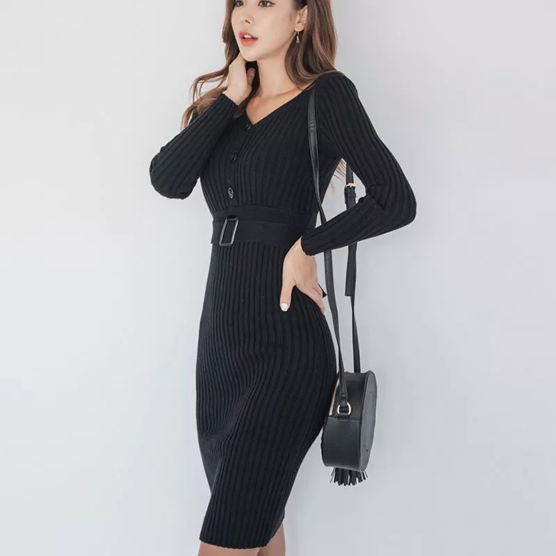 Tubino Vestito Abito Donna Elegante Manica Lunga Maglia Coste Nero Slim 80335