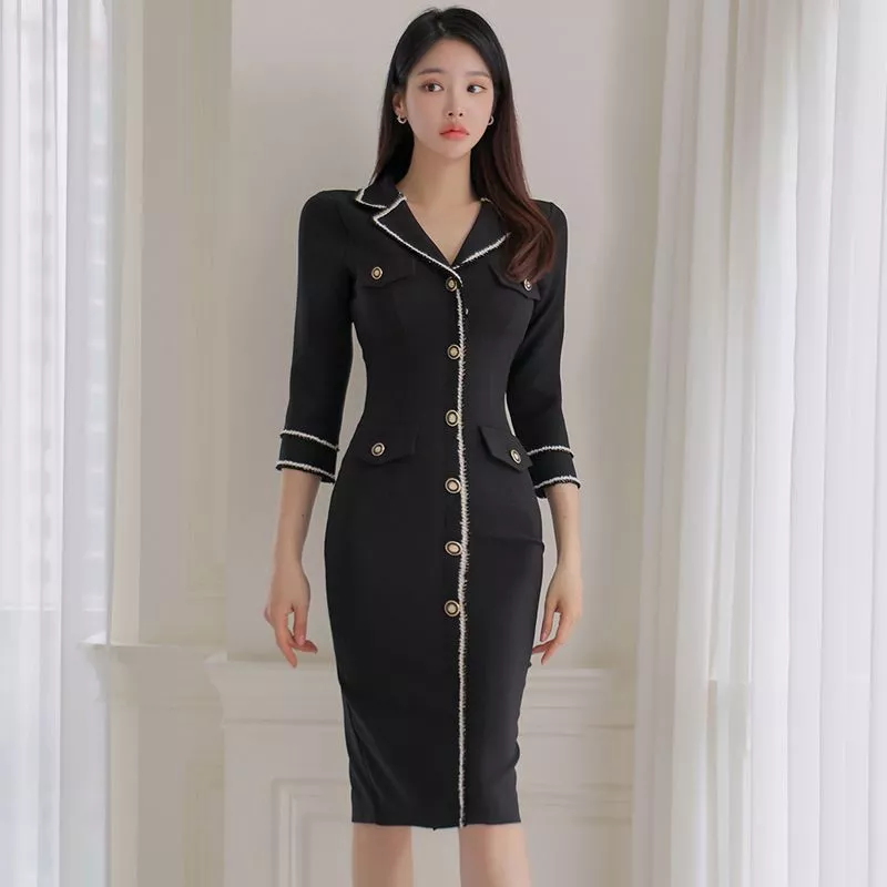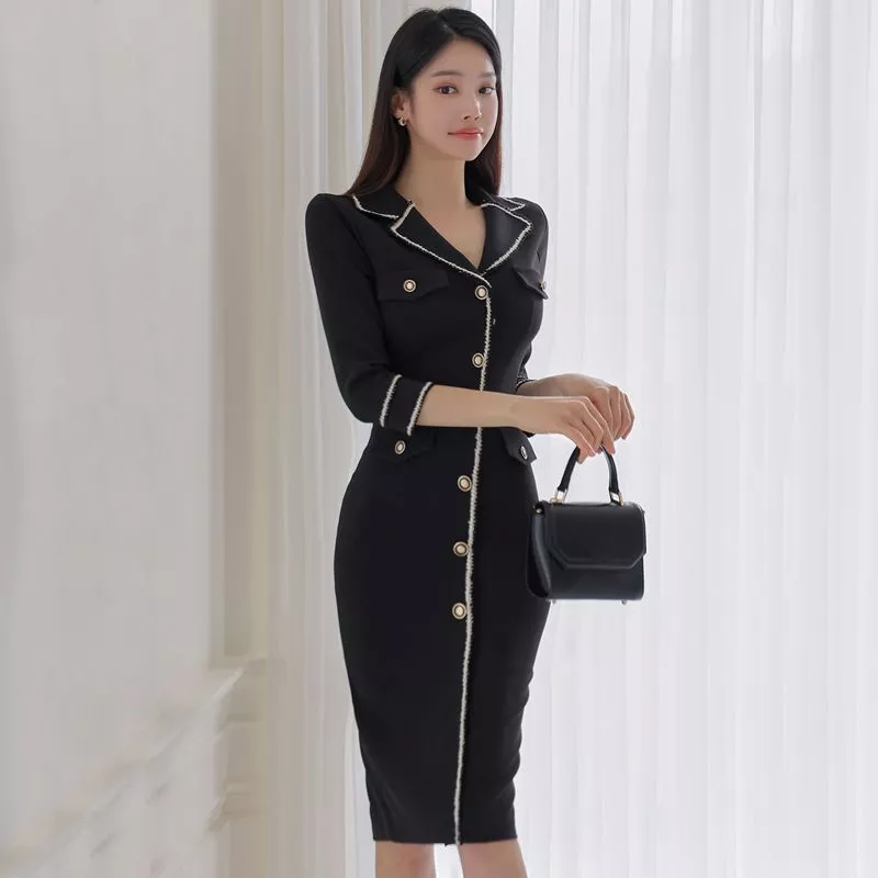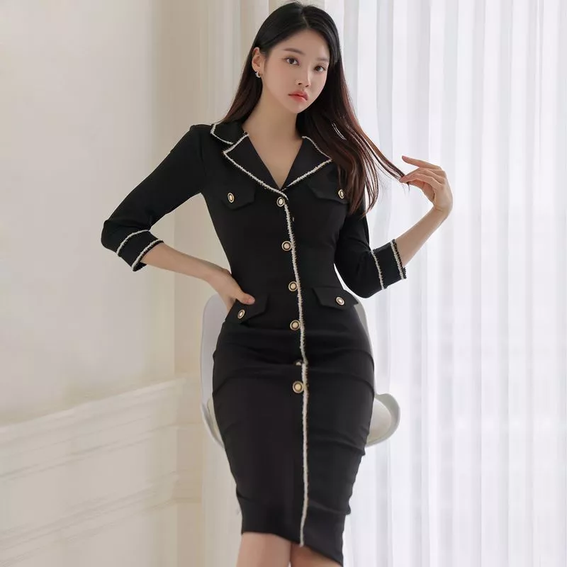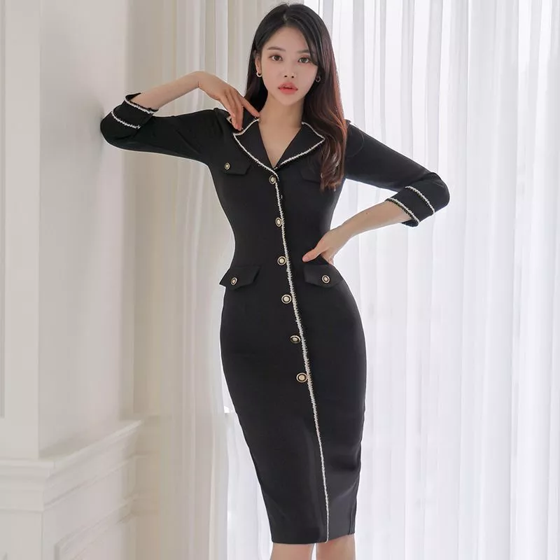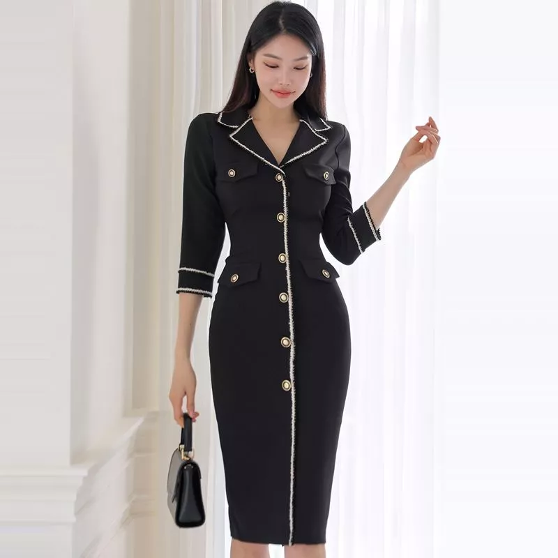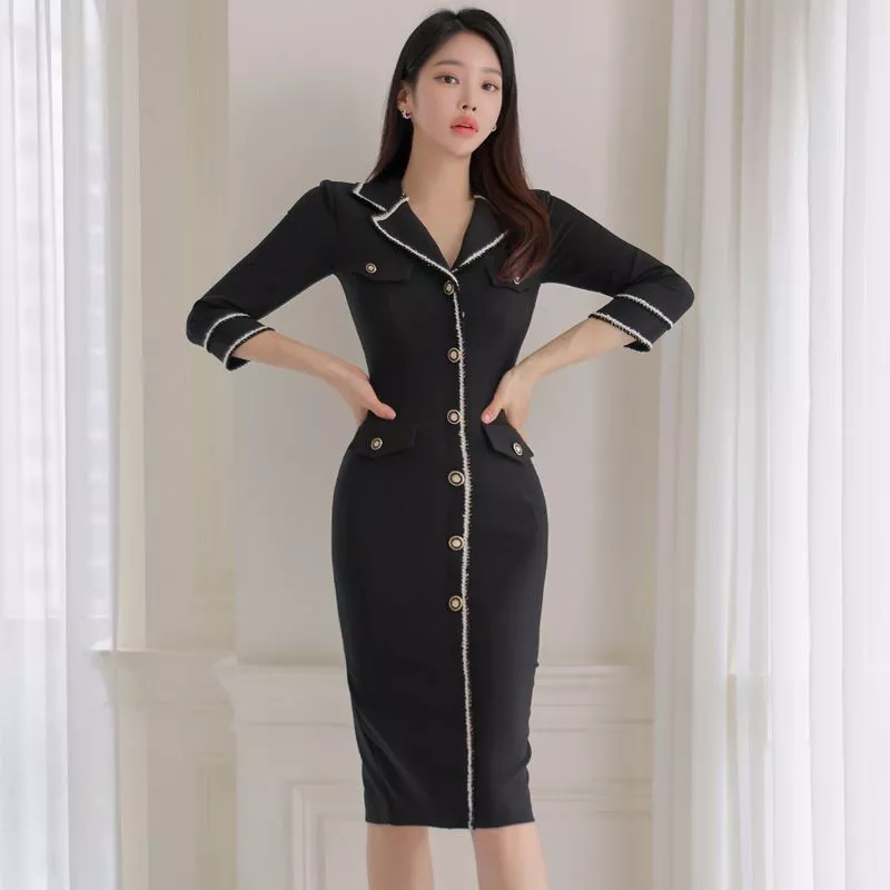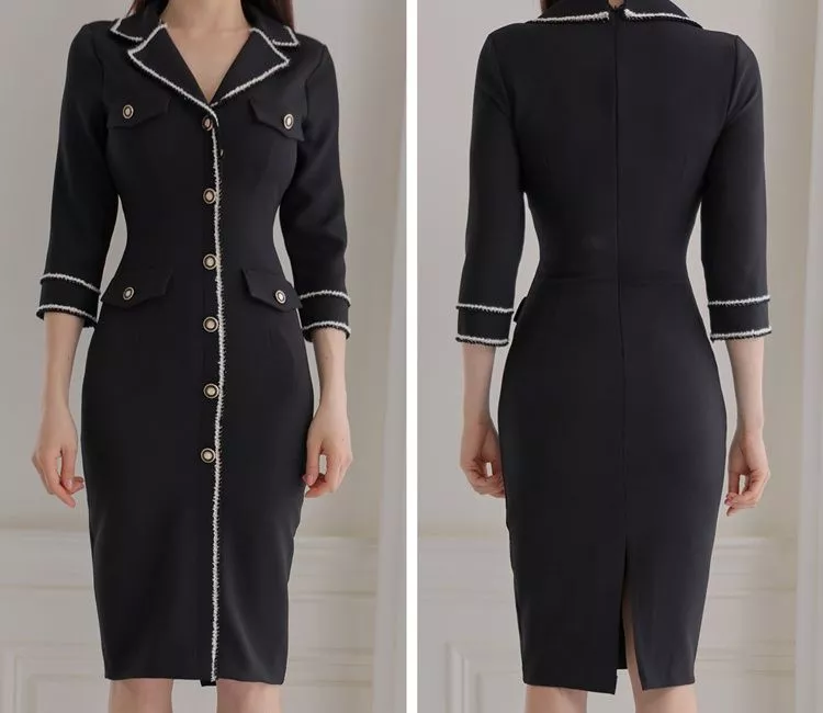 Tubino Vestito Abito Donna Elegante Manica Lunga Nero Slim 05700