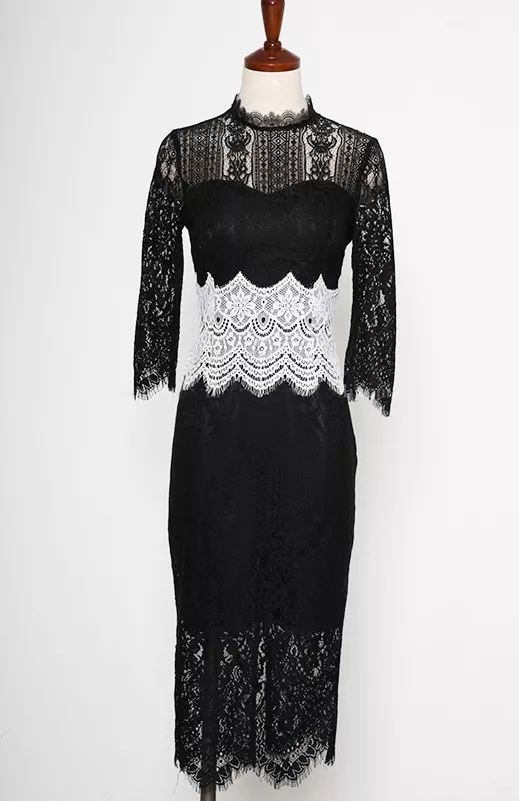 Tubino Vestito Abito Donna Elegante Manica Lunga Pizzo Nero Bianco 58559