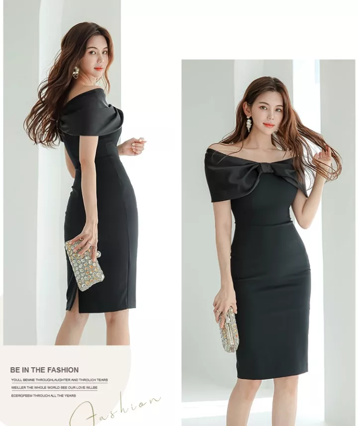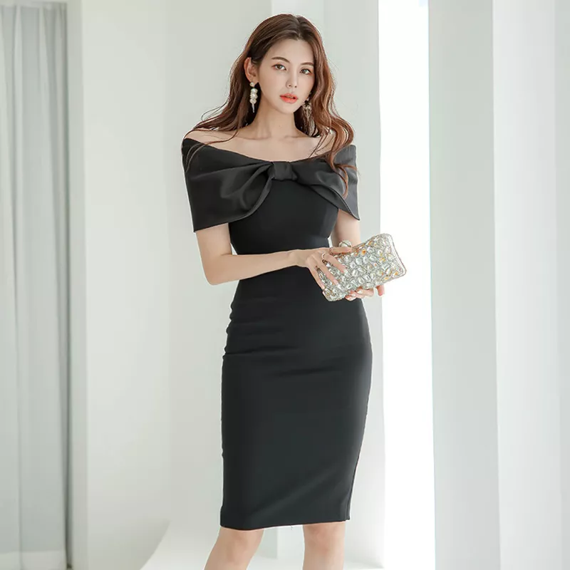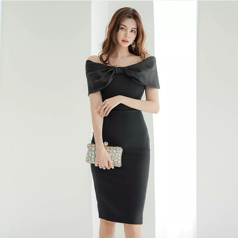 Tubino Vestito Abito Donna Elegante Scollato Slim Ginocchio Nero Fiocco 65743