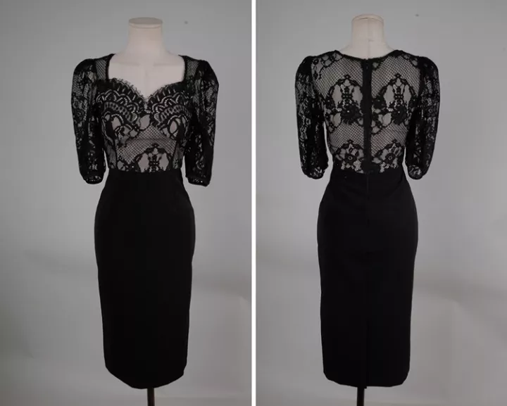 Tubino Vestito Abito Donna Elegante Scollato Slim Nero Pizzo Raso 70989