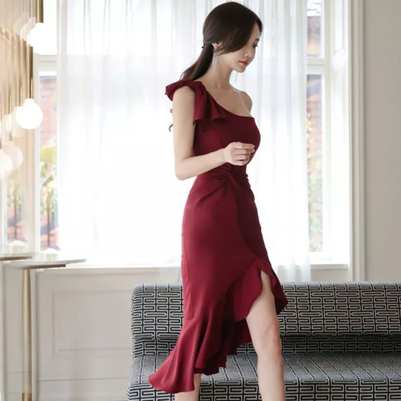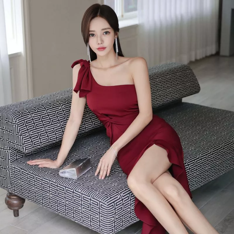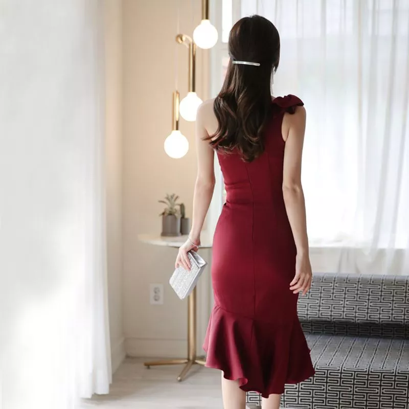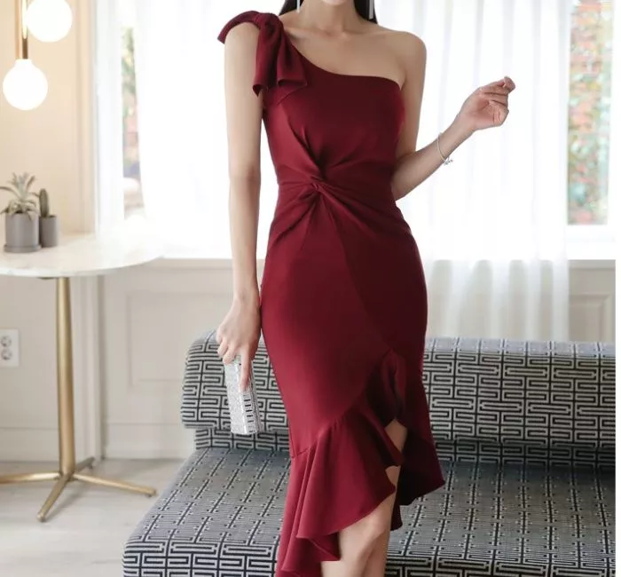 Tubino Vestito Abito Donna Elegante Stretto Slim Raso Rosso Monospalla 22156