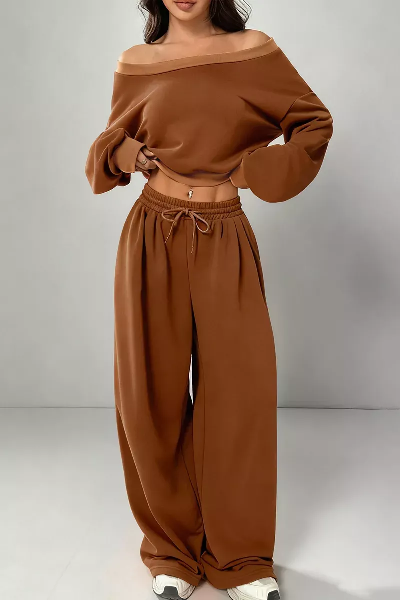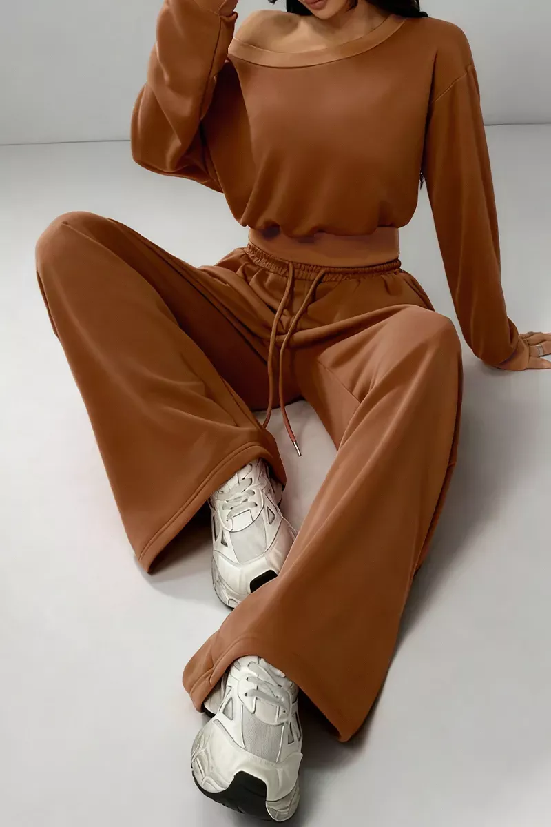 Completo donna due pezzi dal design casual ed elegante, ideale per chi cerca un look moderno e versatile senza rinunciare al comfort. Il set è composto da una felpa con spalle scoperte dal taglio morbido e pantaloni a gamba larga con vita elasticizzata e coulisse regolabile.