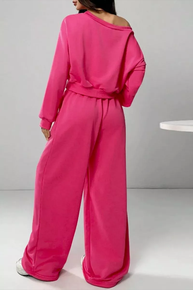 Completo donna due pezzi dal design casual ed elegante, ideale per chi cerca un look moderno e versatile senza rinunciare al comfort. Il set è composto da una felpa con spalle scoperte dal taglio morbido e pantaloni a gamba larga con vita elasticizzata e coulisse regolabile.
