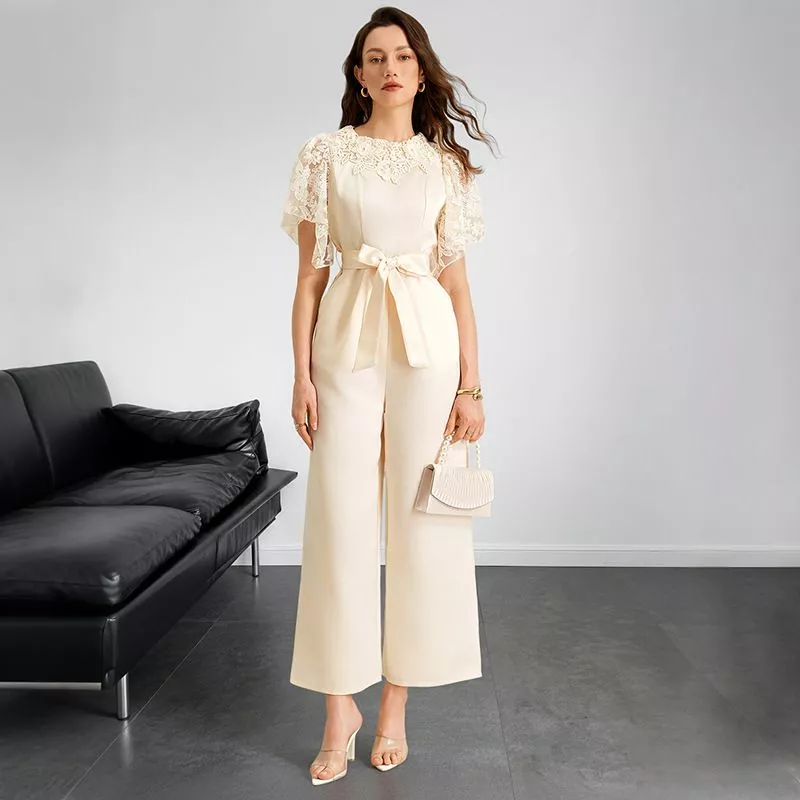 Tuta elegante da donna dal design raffinato e femminile, ideale per cerimonie, eventi serali e occasioni formali. Il modello presenta una linea pulita con pantalone ampio e fluido che slancia la figura, abbinato a un corpino impreziosito da inserto in pizzo lavorato con trasparenze delicate.